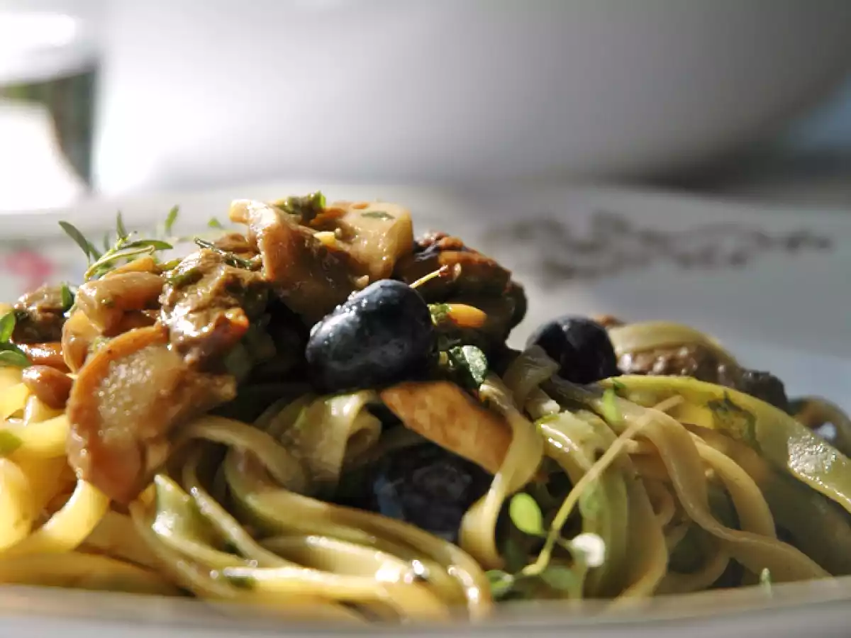 Paglia e fieno ai porcini e mirtilli Portata principalefacile30 min165 Kcal Invia questa ricetta ad un amico Stampa la ricetta Contatta l'autore della Ricetta Pubblica la foto di questa ricetta Ingredienti 4 250 g di tagliatelle all'uovo paglia e fieno 300 g di porcini 80 g di mirtilli timo olio extravergine di oliva aglio sale e pepe Costo stimato: 3.94Euros€ (0.98€/Porzioni)