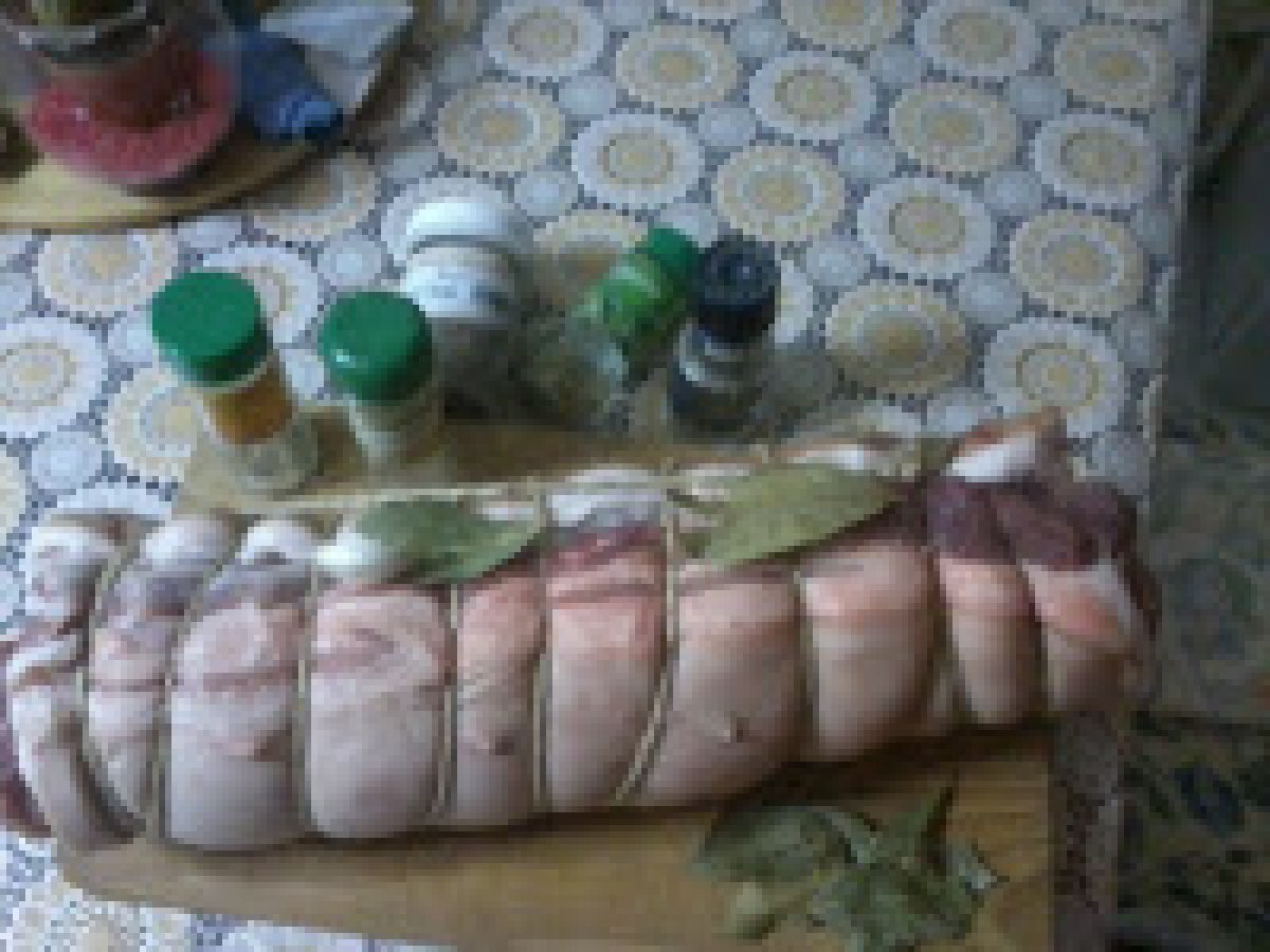 Pancetta porchettata vota adesso PrecedenteProssimo Portata principalefacile5 h 30 m Invia questa ricetta ad un amico Stampa la ricetta Contatta l'autore della Ricetta Pubblica la foto di questa ricetta Ingredienti 6 Una pancetta 5,470kg Sale pepe origano salvia maggiorana timo finocchietto rosmarino aglio dado granulato alloro bacche di ginepro tritate