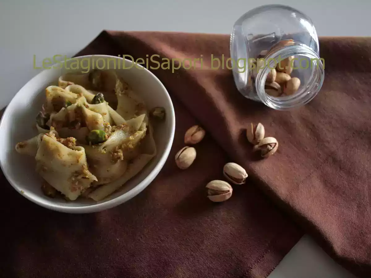 Pappardelle a nido e pesto di pistacchi Portata principalefacile25 min496 Kcal Invia questa ricetta ad un amico Stampa la ricetta Contatta l'autore della Ricetta Pubblica la foto di questa ricetta Ingredienti 4 300 g di pappardelle a nido 120 g di pistacchi iraniani 2 cucchiai abbondanti di grana padano 1 velo di aglio 1 pizzico di pepe verde Olio evo q.b. Costo stimato: 3.59Euros€ (0.9€/Porzioni)