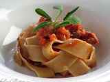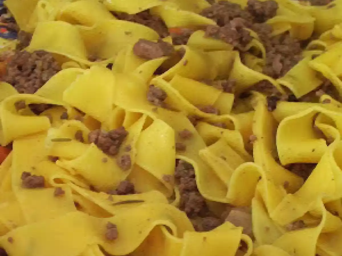 Pappardelle al ragù di cinghiale. vota adesso Portata principalefacile40 min Invia questa ricetta ad un amico Stampa la ricetta Contatta l'autore della Ricetta Pubblica la foto di questa ricetta Ingredienti 4 1 kg di pappardelle, circa 600 g di carne macinata mista di bovino e suino, piuttosto grassa, circa 200 g di cinghiale a pezzetti di vario tipo qualche nervetto qualche pezzo di altro animale, selvaggina o no 1 gambo di sedano piccolo 1 cipolla piccola 1 carota odori misti: una noce di burro 2-3 cucchiai d'olio d'oliva qualche mestolo di brodo di carne sale, pepe, peperoncino