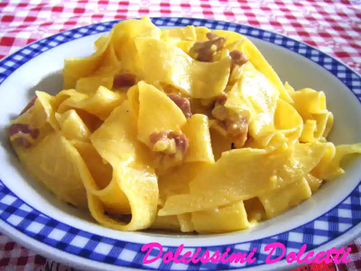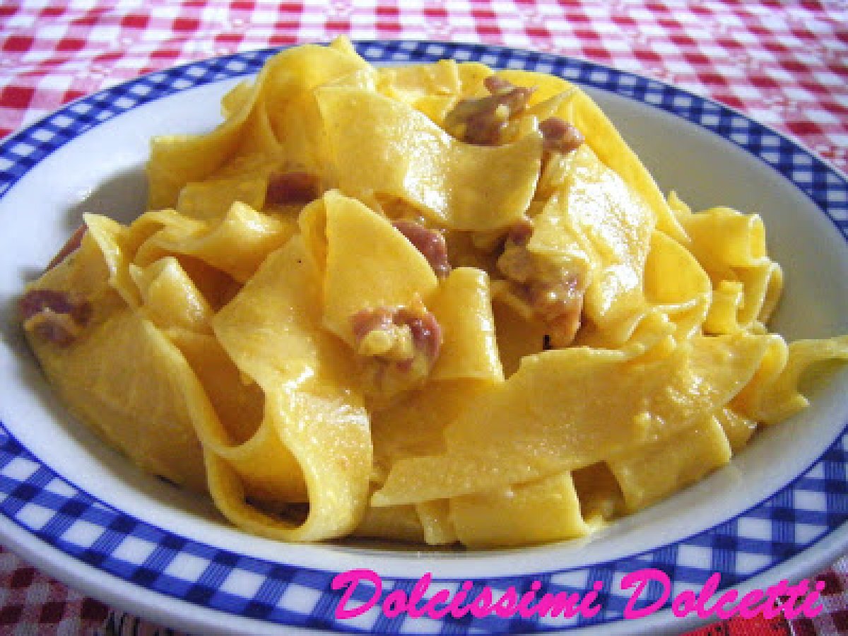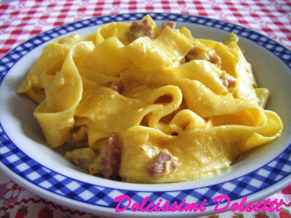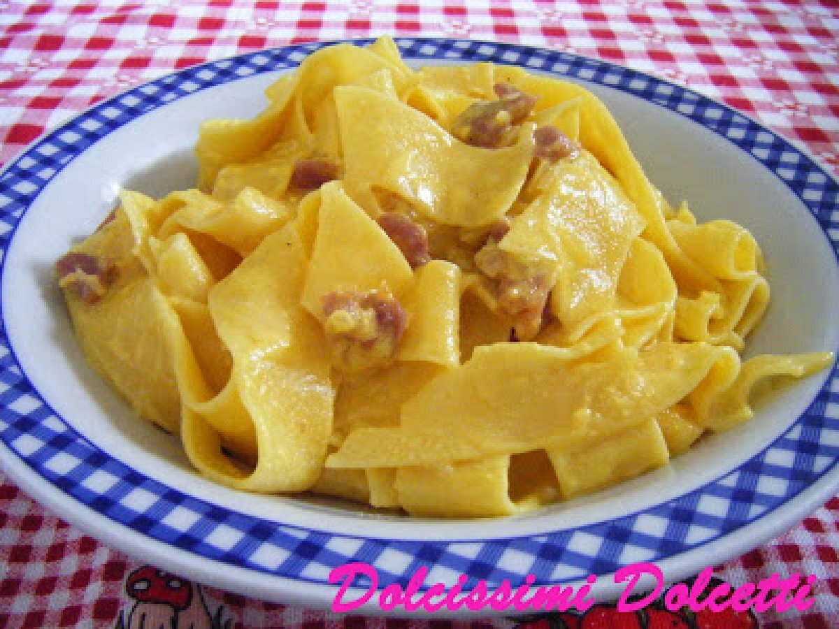 Pappardelle alla papalina vota adesso PrecedenteProssimo Portata principalefacile45 min734 Kcal Invia questa ricetta ad un amico Stampa la ricetta Contatta l'autore della Ricetta Pubblica la foto di questa ricetta Ingredienti 5 500 g di pappardelle 140 g di prosciutto crudo tagliato a cubettini 1 piccola cipolla 50 g di burro 3 uova 200 ml di panna da cucina 40 g di parmigiano grattugiato sale pepe nero Costo stimato: 8.14Euros€ (1.63€/Porzioni)