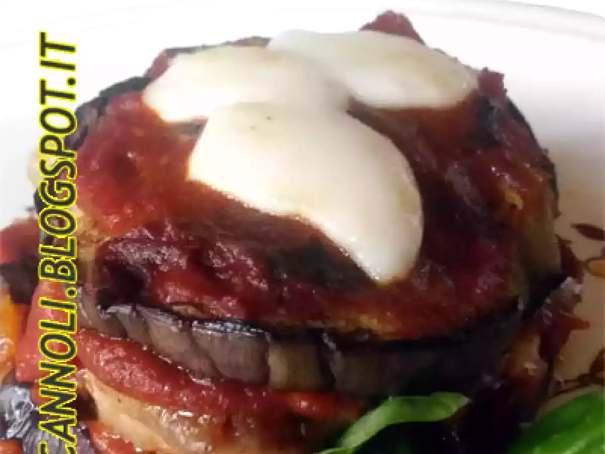 - Prendiamo adesso una pirofila e sistemiamo le nostre fettine di melanzana per farne delle monoporzioni, quindi mettiamo un pò di pomodoro, il tacchino, il pomodoro, il formaggio e altra fetta di melanzana, pomodoro e per finire il formaggio, facciamo questo procedimento per tutte le porzioni, e mettiamo in forno a 180° per 10/15 minuti, il tempo necessario per far sciogliere il formaggio e far amalgamare bene tutti gli ingredienti.