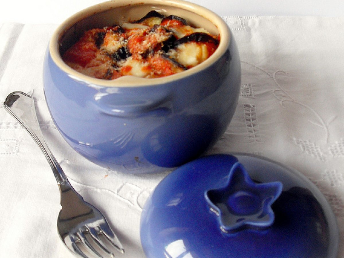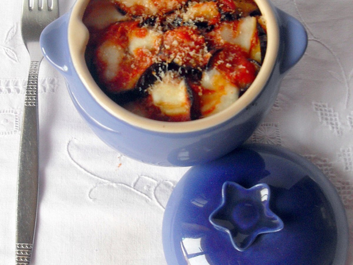 Parmigiana in cocotte le creuset PrecedenteProssimo Portata principalefacile30 min Invia questa ricetta ad un amico Stampa la ricetta Contatta l'autore della Ricetta Pubblica la foto di questa ricetta Ingredienti 4 Per 2 cocotte: 2 melanzane 150 g di provola 200 g di pomodori pelati in barattolo Parmigiano reggiano q.b. 1 spicchio daglio Olio Sale e pepe q.b.