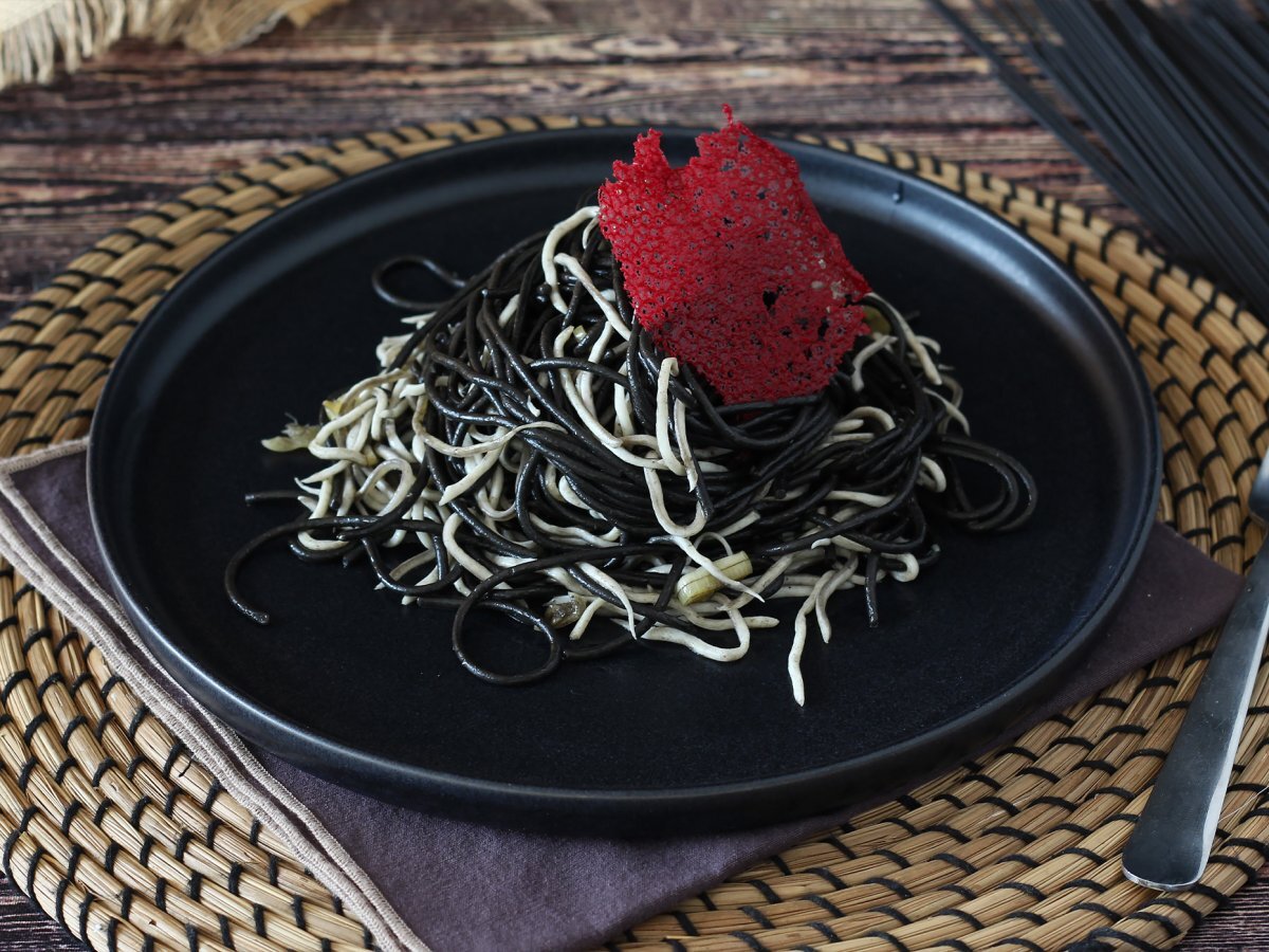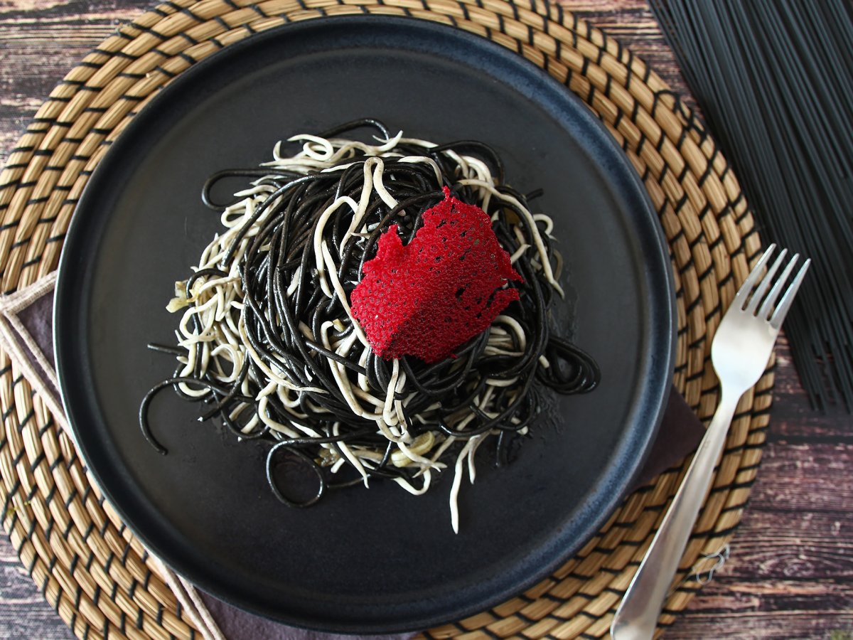 E voi li conoscete gli spaghetti al nero di seppia? All’impasto viene aggiunto l’inchiostro della seppia come colorante e l’effetto è davvero affascinante. Si può decidere anche di usarlo come condimento, principalmente per piatti di mare. Oggi vi proponiamo la nostra ricetta, arricchita da una componente speciale: le gulas. Si tratta di un ingrediente che abbiamo comprato in Spagna, essenzialmente surimi di merluzzo. L’abbiamo condito infine con aglio e peperoncino. Il contrasto tra i due colori è perfetto. Adesso preparate gli ingredienti e seguendo il procedimento passo dopo passo date vita al piatto più scenografico del momento!