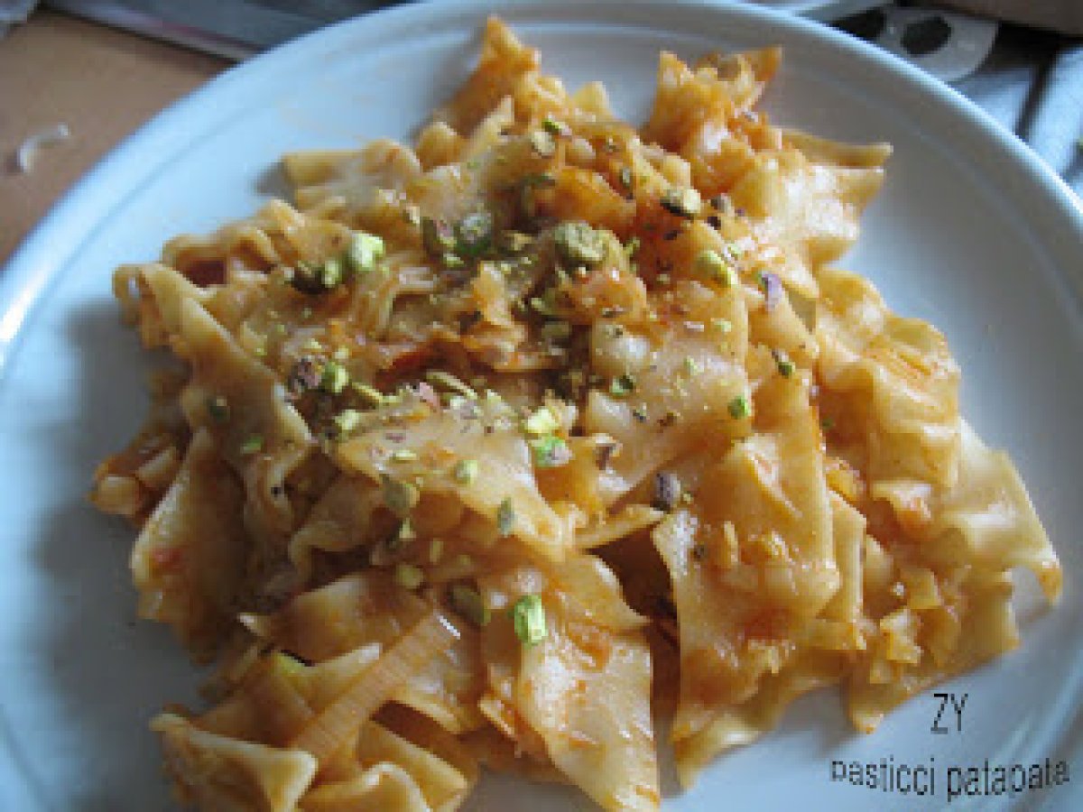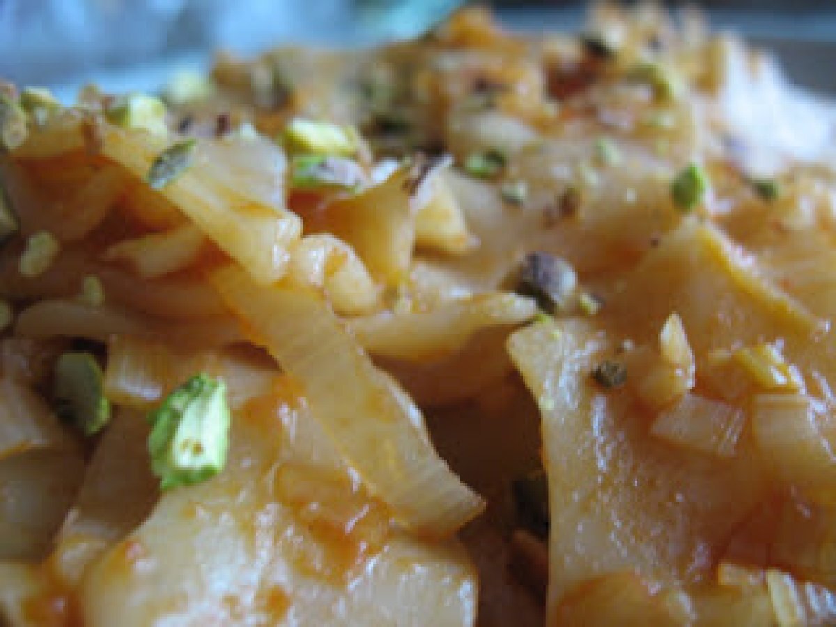 Pasta al sugo di porri e pistacchi PrecedenteProssimo Portata principalefacile30 min Invia questa ricetta ad un amico Stampa la ricetta Contatta l'autore della Ricetta Pubblica la foto di questa ricetta Ingredienti 2 pasta preferita 1 porro medio-piccolo 1/2 bicchiere di vino bianco secco passata di pomodoro 2 cucchiai di olio extravergine d'oliva mezza tazza d'acqua di cottura o brodo vegetale 2 cucchiai di salsa di soia un cucchiaino di tzatar una manciata di pistacchi sgusciati e tritati grossolanamente