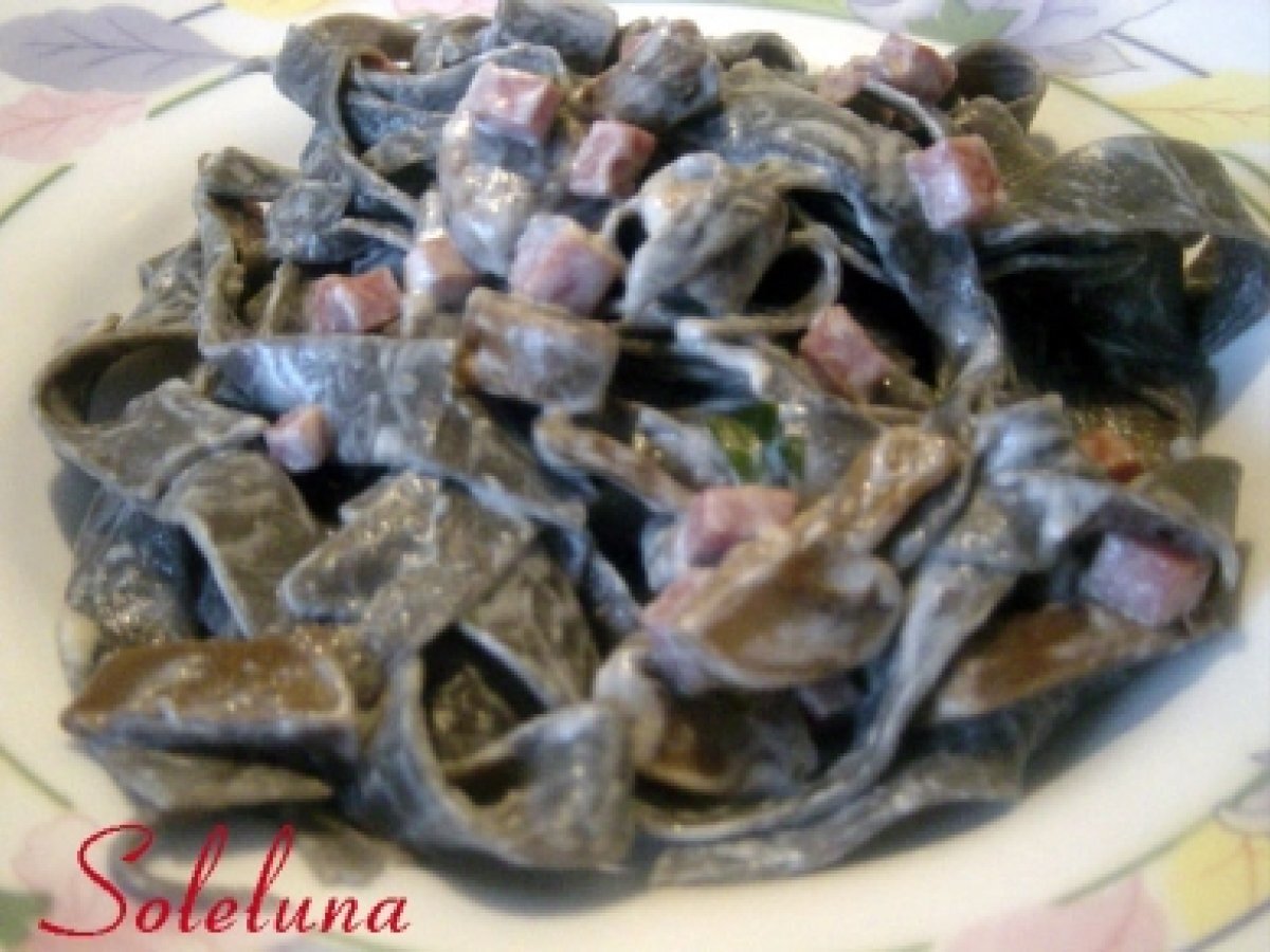 Pasta alla pirata dei monti vota adesso PrecedenteProssimo Portata principalefacile50 min Invia questa ricetta ad un amico Stampa la ricetta Contatta l'autore della Ricetta Pubblica la foto di questa ricetta Ingredienti 5 per la pasta : 250 g di farina 00 250 g di farina di semola 4 uova 4 bustine di nero di seppia per il sugo: 500 g di funghi champignon 150 g di prosciutto cotto a dadini 200 g di panna 1 bicchiere di vino bianco prezzemolo tritato 1 spicchio di aglio olio extravergine di oliva sale e pepe q.b.
