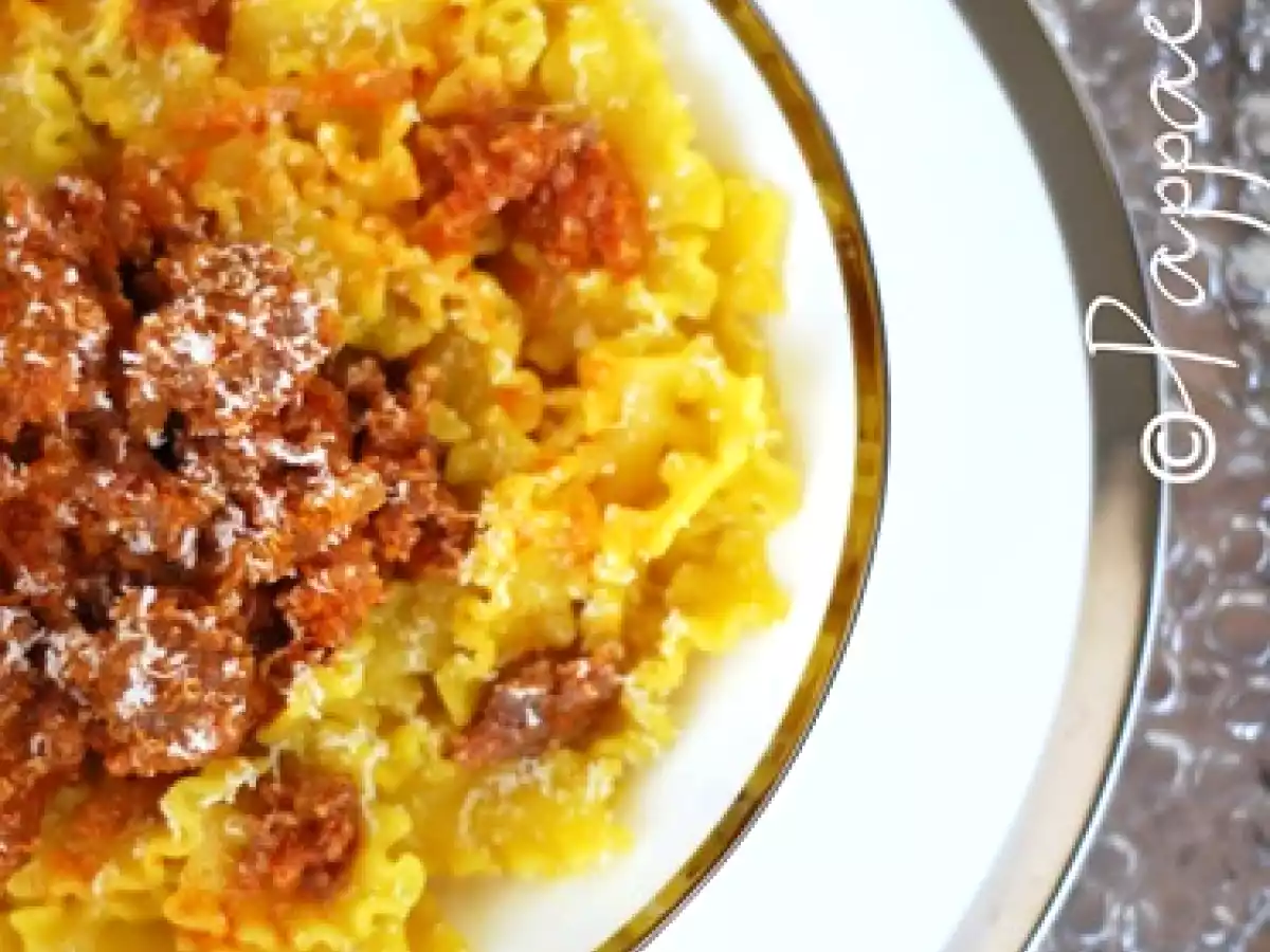 Pasta allo zafferano con ragù di salsiccia e cipolla fondente PrecedenteProssimo Portata principalefacile55 min Invia questa ricetta ad un amico Stampa la ricetta Contatta l'autore della Ricetta Pubblica la foto di questa ricetta Ingredienti 3 per il sugo : 300 g di salsiccia fresca Una cipolla tre cucchiai di olio evo due cucchiai colmi di concentrato di pomodoro sale q.b. poca acqua Per la pasta : 300 g di Mafalda corta Garofalo due bustine di zafferano in polvere una noce di burro 40 g di Grana Padano