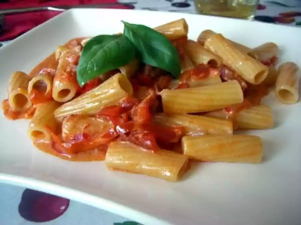 Pasta con i peperoni Portata principalefacile55 min Invia questa ricetta ad un amico Stampa la ricetta Contatta l'autore della Ricetta Pubblica la foto di questa ricetta Ingredienti 2 cipolla burro olio e peperoncino 200 g di prosciutto cotto o speck 3/4 peperoni rossi belli carnosi brandy basilico 1/2 bottiglia di passata di pomodoro 250 g panna da cucina parmigiano sale 500 g di tortiglioni