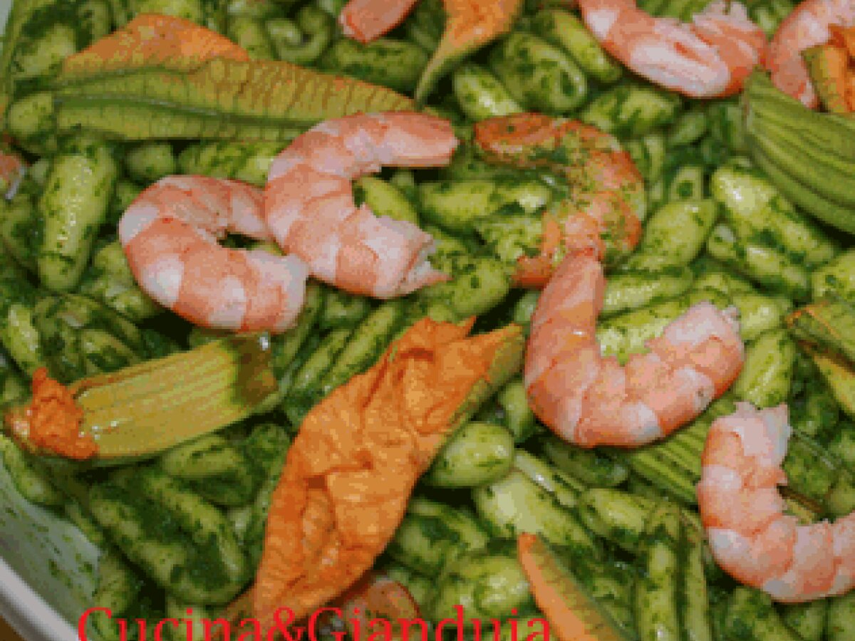 Pasta con pesto di rucola, fiori di zucca e gamberetti