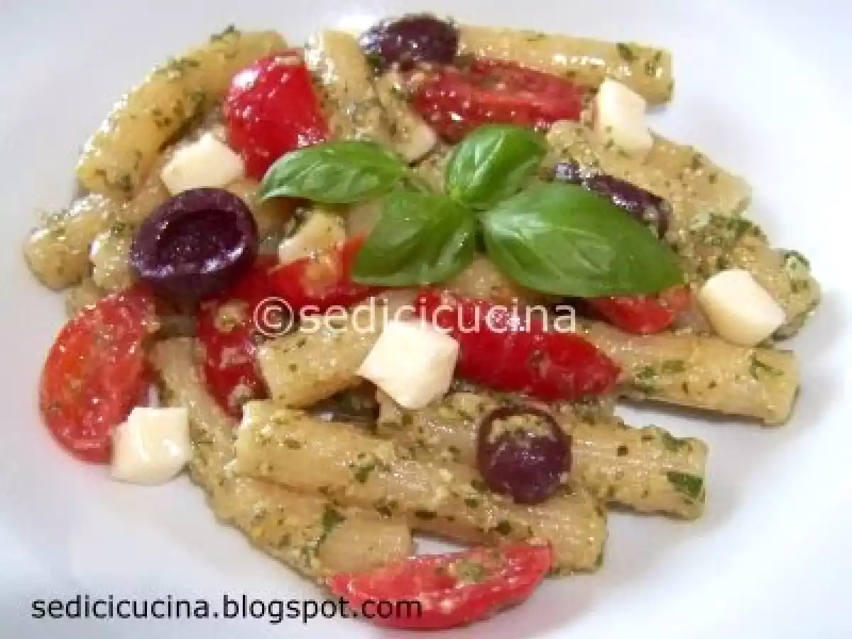 Pasta fredda al pesto, con pomodorini, scamorza, ed olive di gaeta
