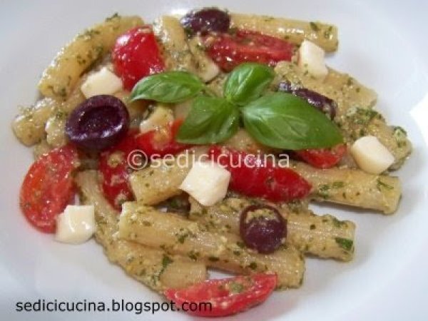 Una buonissima pasta fredda dove il gusto predominante è il pesto ligure con leggero sapore di pomodorini e olive.