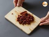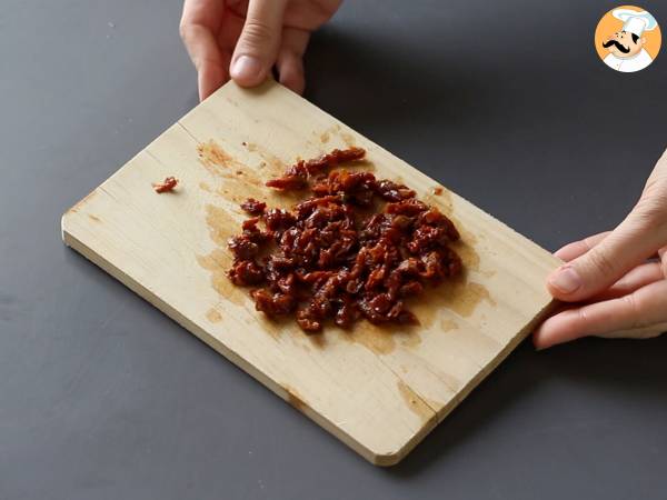 Se preferite, potete mettere i pomodori secchi in ammollo in acqua per dieci minuti prima di tagliarli a pezzi
