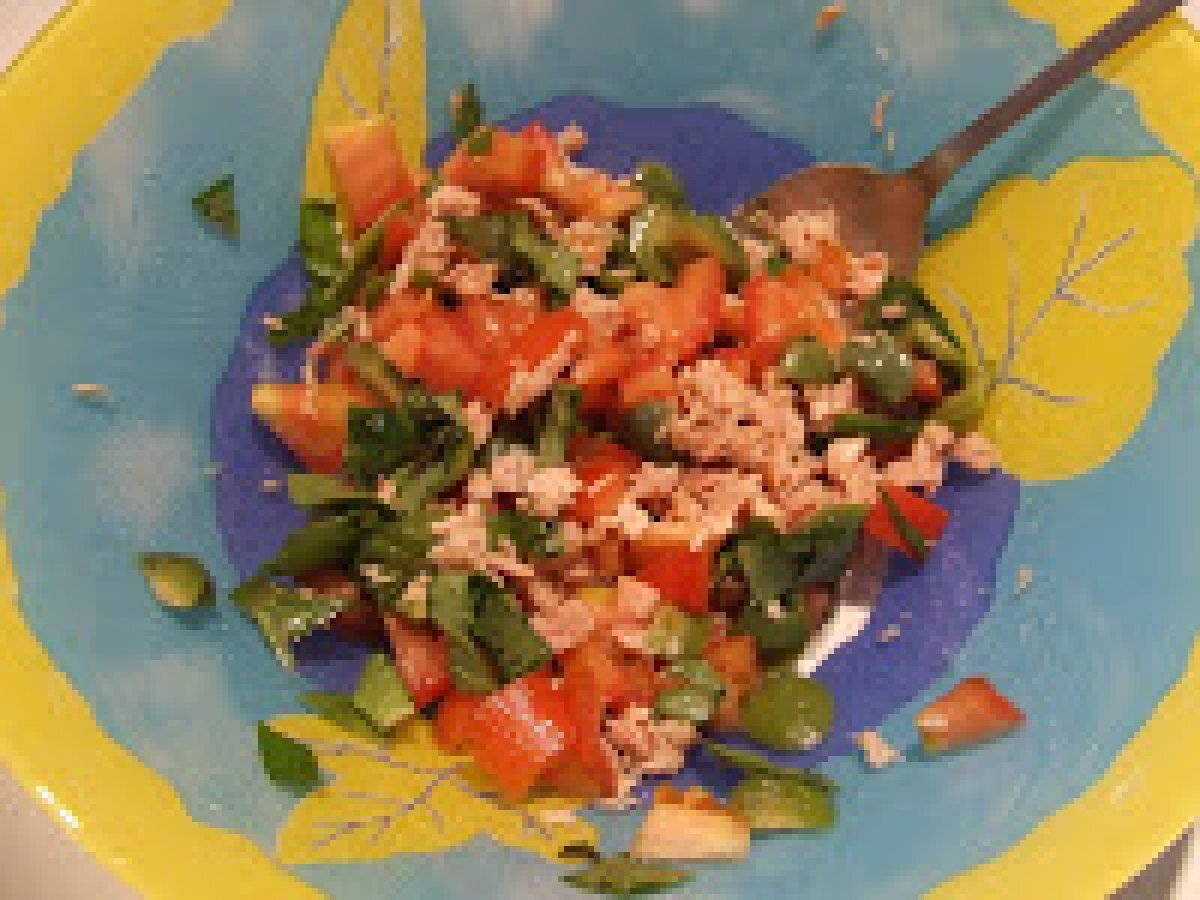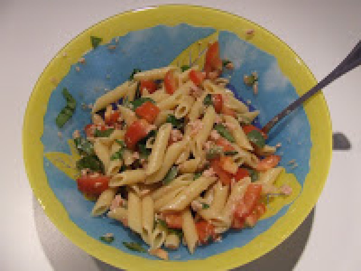 Pasta fredda tonno e pomodori PrecedenteProssimo Portata principalefacile15 min532 Kcal Invia questa ricetta ad un amico Stampa la ricetta Contatta l'autore della Ricetta Pubblica la foto di questa ricetta Ingredienti 4 360 g di penne rigate 4 pomodori per insalata 2 scatolette di tonno 10 olive verdi greche basilico fresco sale e pepe 4 cucchiai di olio d'oliva Costo stimato: 4.95Euros€ (1.24€/Porzioni)