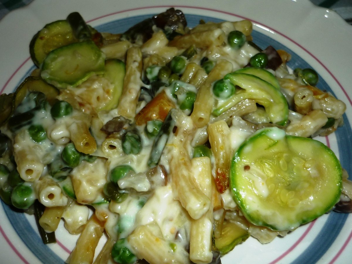 Pasta gratinata con verdure Portata principalemedia40 min497 Kcal Invia questa ricetta ad un amico Stampa la ricetta Contatta l'autore della Ricetta Pubblica la foto di questa ricetta Ingredienti 6 Dosi per sei persone: 400 grammi di pasta (formato corto preferibilmente di cottura non troppo rapida); 50 grammi di crescenza; 50 grammi di grana grattugiato; 200 grammi di melanzane (una di piccola - media dimensione); 300 grammi di zucchine (una media); 200 grammi di piselli; 300 grammi di zucca gialla; mezza cipolla grande; 2 cucchiai di olio. Per la besciamella: 500 ml di latte; 40 grammi di burro; 40 grammi di farina; noce moscata; un pizzico di sale.