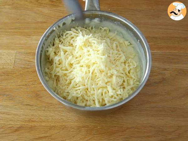 Togliete la pentola dal fuoco ed aggiungete l'Emmental grattugiato e la mozzarella tritata. Quindi mescolate.