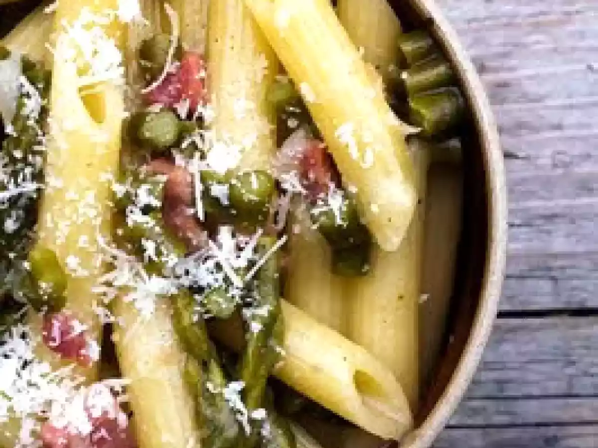 Pasta risottata agli asparagi selvatici Portata principalefacile20 min Invia questa ricetta ad un amico Stampa la ricetta Contatta l'autore della Ricetta Pubblica la foto di questa ricetta Ingredienti 2 160 g di pasta corta 1/2 cipolla piccola 2 cucchiai di pancetta a cubetti 1 dozzina di asparagi selvatici vino bianco acqua parmigiano sale, noce moscata