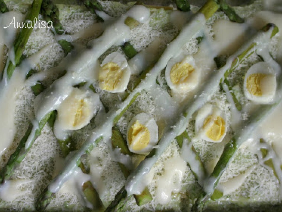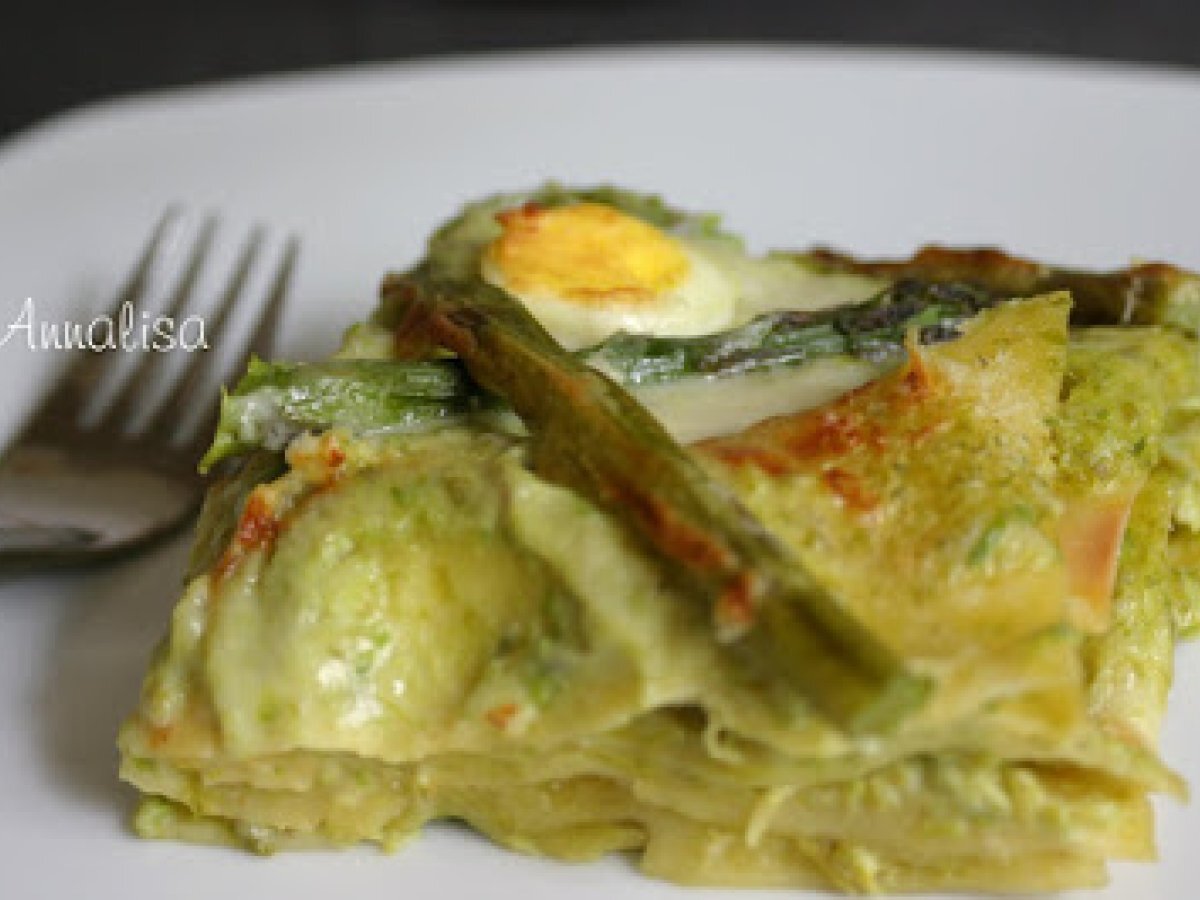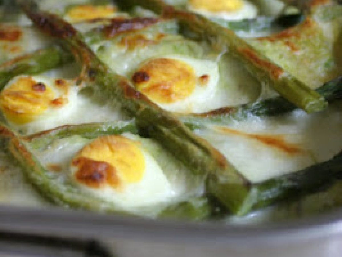 Pasticcio con crema di asparagi vota adesso PrecedenteProssimo Portata principalefacile1 h 10 m Invia questa ricetta ad un amico Stampa la ricetta Contatta l'autore della Ricetta Pubblica la foto di questa ricetta Ingredienti 6 600 g di asparagi verdi 500 g lasagne 600 ml di besciamella 6 uova di quaglia sode grana padano a piacere