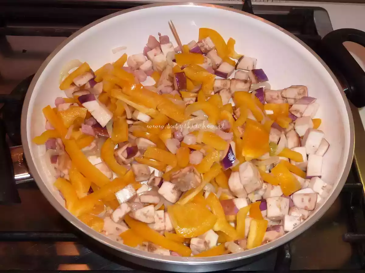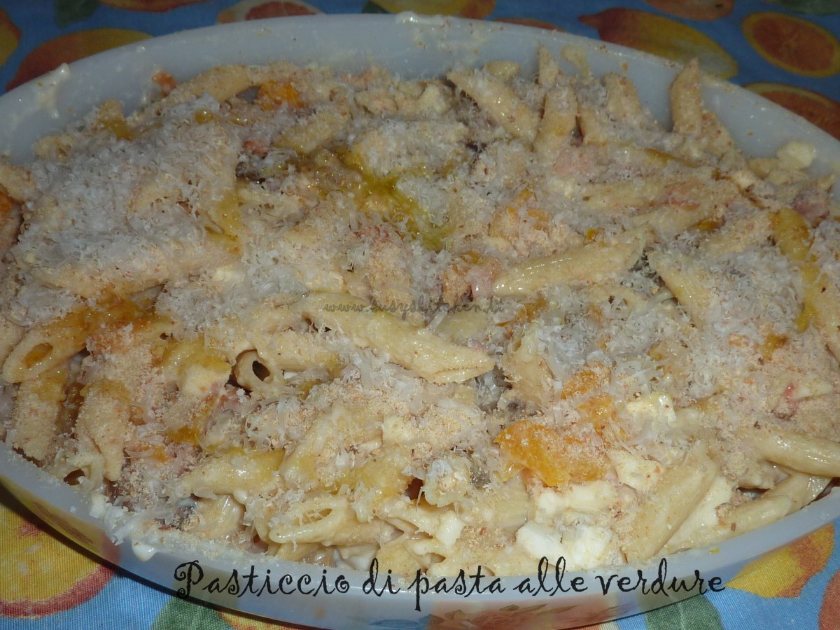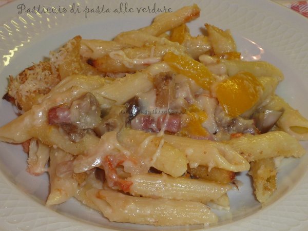 Pasticcio di pasta gratinato alle verdure PrecedenteProssimo Portata principalemedia50 min814 Kcal Invia questa ricetta ad un amico Stampa la ricetta Contatta l'autore della Ricetta Pubblica la foto di questa ricetta Ingredienti 4 250 gr di pasta tipo maccheroni 1 cipolla 1 peperone grande giallo/rosso 1 melanzana 100 gr di pancetta a cubetti 1 mozzarella 2 manciate di pane grattuggiato formaggio grana ( non indispensabile) qualche fiocchetto di burro vino bianco per sfumare olio e.v.o sale q.b pepe q.b per la besciamella 30 gr di burro 2 cucchiai di farina 1,5 bicchieri di latte