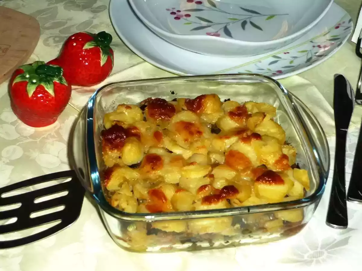 Patate al forno ricche Portata principalemedia35 min629 Kcal Invia questa ricetta ad un amico Stampa la ricetta Contatta l'autore della Ricetta Pubblica la foto di questa ricetta Ingredienti 4 1kg di patate; 3 zucchine media grandezza; 300 grammi di funghi champignons; una cipolla; 100 grammi di pancetta affumicata tagliata a cubetti; 100 grammi di provola; 50 grammi di parmigiano grattugiato; 4 cucchiai di olio d'oliva. Costo stimato: 8.96Euros€ (2.24€/Porzioni)