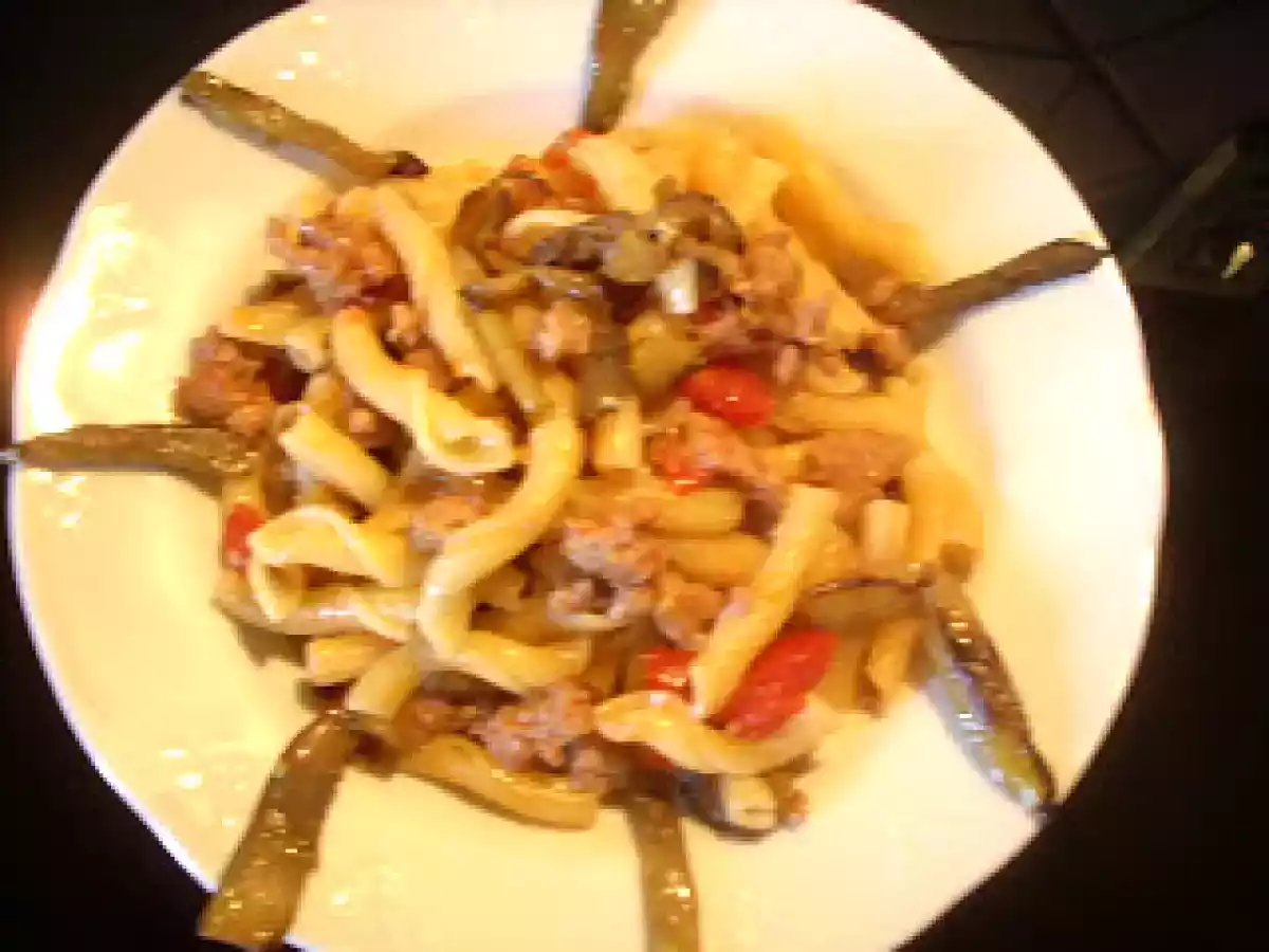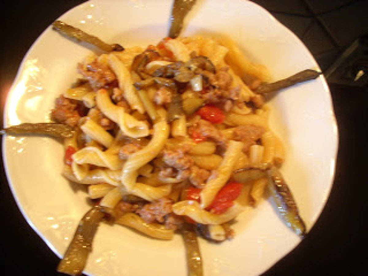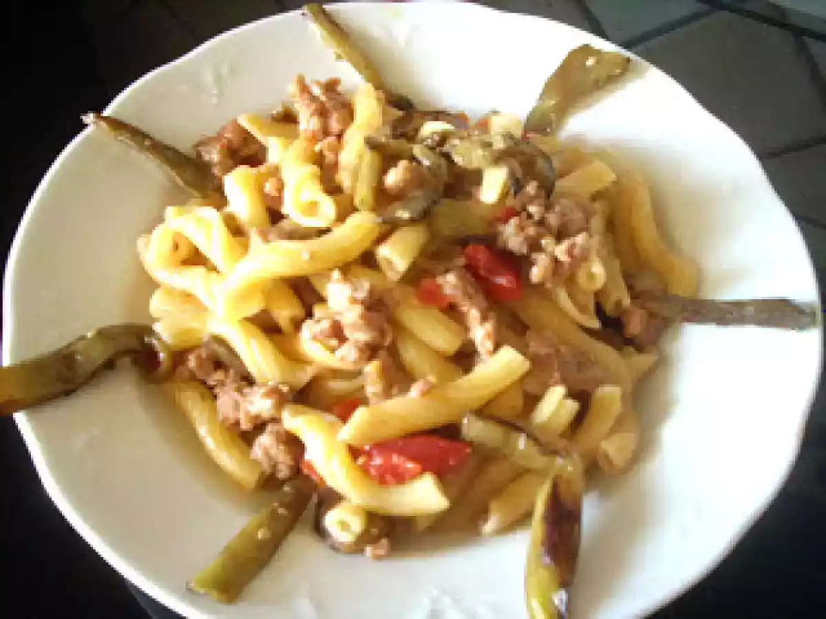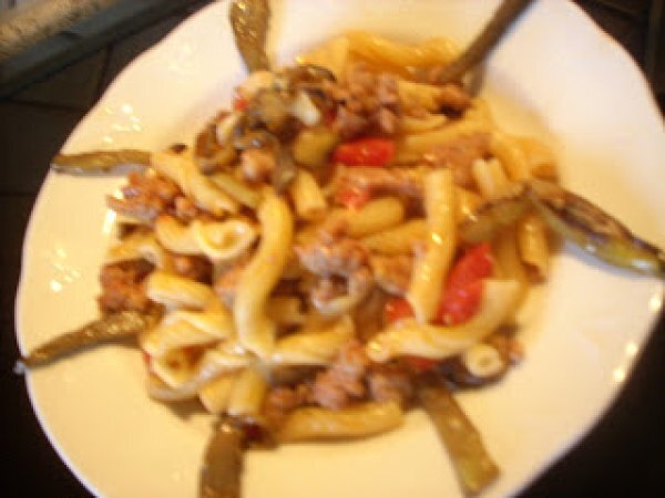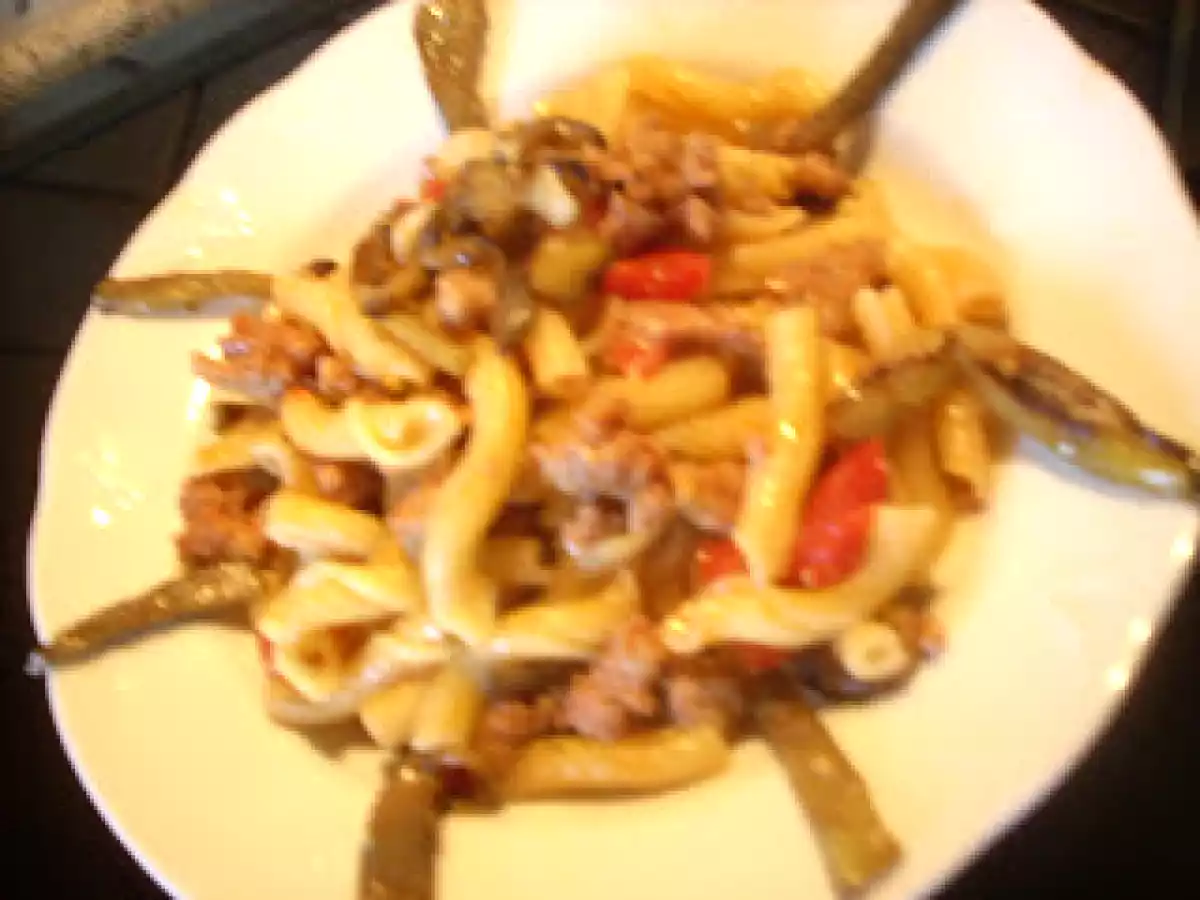 Penne ricce con salsiccia, melanzane e cipolla di tropea caramellata... PrecedenteProssimo Portata principalefacile50 min Invia questa ricetta ad un amico Stampa la ricetta Contatta l'autore della Ricetta Pubblica la foto di questa ricetta Ingredienti 4 400 g penne ricce 300 g di salsiccia fresca 150 g di pomodori ciliegini 200 g di melanzane 150 g di cipolla di tropea 1/2 bicchiere di vino rosso 1 cucchiaino di zucchero Olio d'oliva q.b. Timo q.b Sale e pepe q.b.