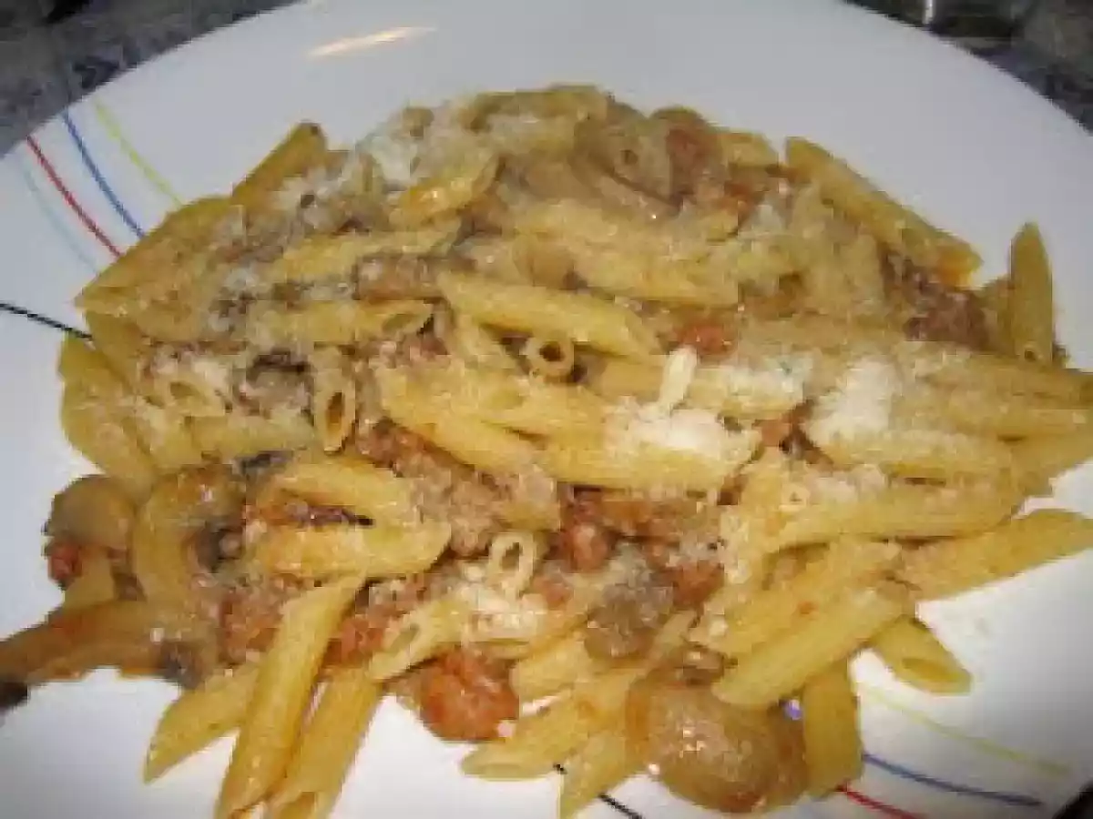 Penne salsiccia e funghi Portata principalefacile35 min Invia questa ricetta ad un amico Stampa la ricetta Contatta l'autore della Ricetta Pubblica la foto di questa ricetta Ingredienti 4 400 g di penne rigate 3 o 4 salsicce piccanti 400 g di funghi champignon un bicchiere di passata di pomodoro mezzo bicchiere di vino bianco sale olio EVO uno spicchio di aglio
