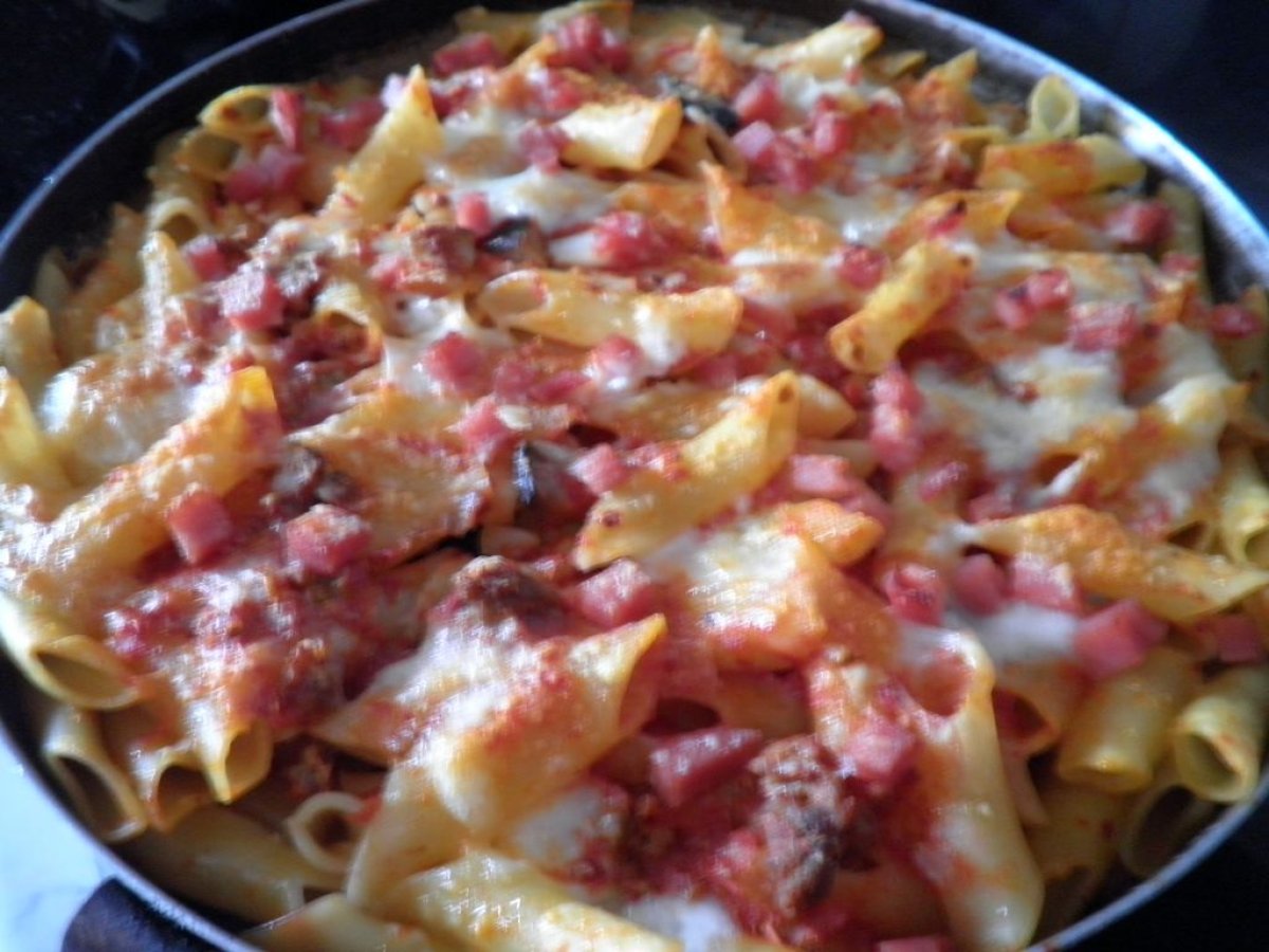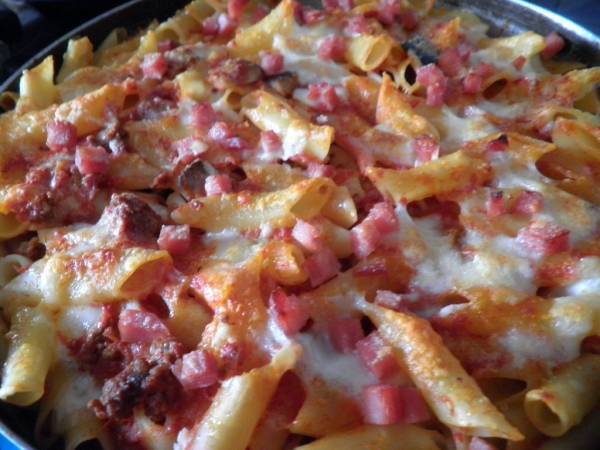 Pennette al ragù gratinate al forno con prosciutto e mozzarella