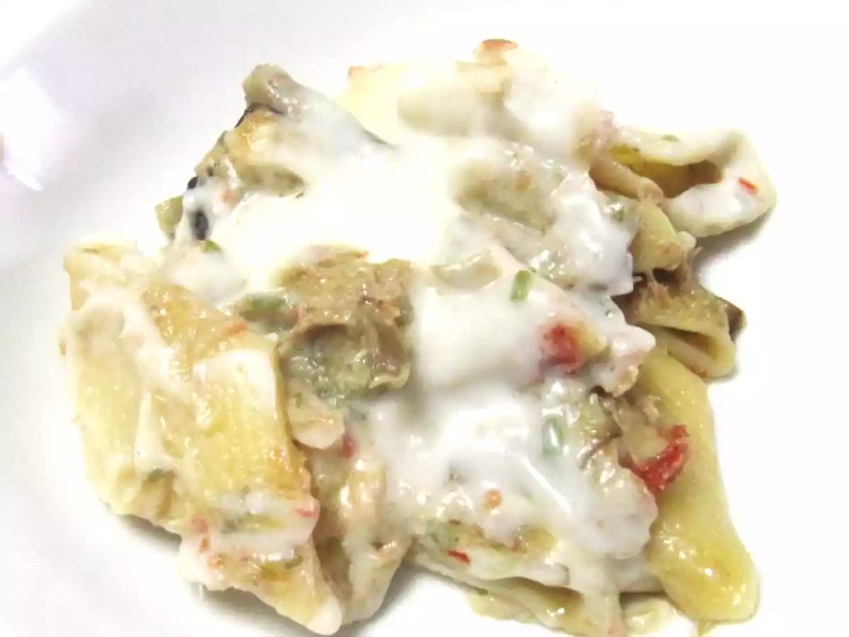 Le grandi penne napoletane pasticciate con zucchini, carciofi, tonno, quadretti di melanzana fritti, pomodori secchi, ammorbidite da besciamella e gratinate in forno.