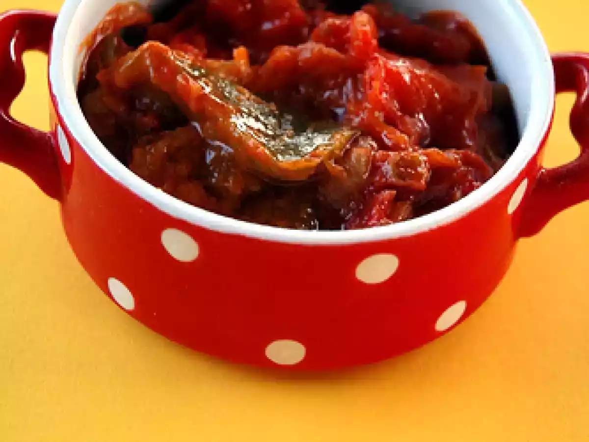 Altresì potrebbe formarsi troppa acqua durante la cottura, quindi lasciare scoperto e proseguire. - A cottura ultimata travasare la peperonata in una terrina e servirla in tavola come accompagnamento per carni alla brace o addirittura lesse. La trovo prelibata da sola stesa su una fetta di pane scaldato o consumata in contrasto con cibi freschi come il melone.