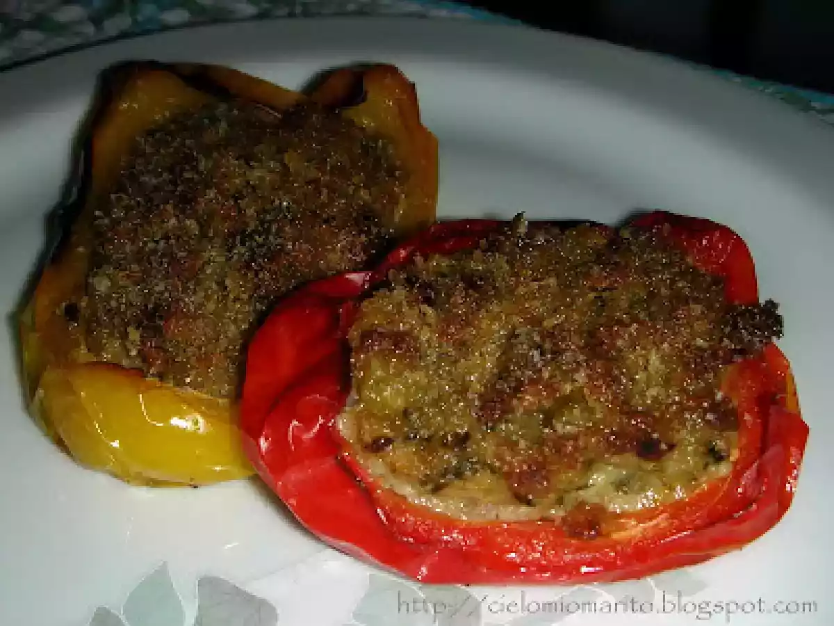 Peperoni ripieni di nonna celeste PrecedenteProssimo Portata principalefacile1 h 30 m Invia questa ricetta ad un amico Stampa la ricetta Contatta l'autore della Ricetta Pubblica la foto di questa ricetta Ingredienti 2 1 peperone rosso 1 peperone giallo 2 o 3 fette di pane raffermo 1 cucchiaino colmo di capperi 2 acciughe sotto sale 30 g di olive nere snocciolate 2 scatolette di tonno da 80 g. 1 cucchiaio di prezzemolo tritato latte olio extravergine di oliva pangrattato burro