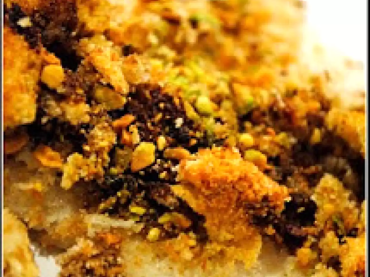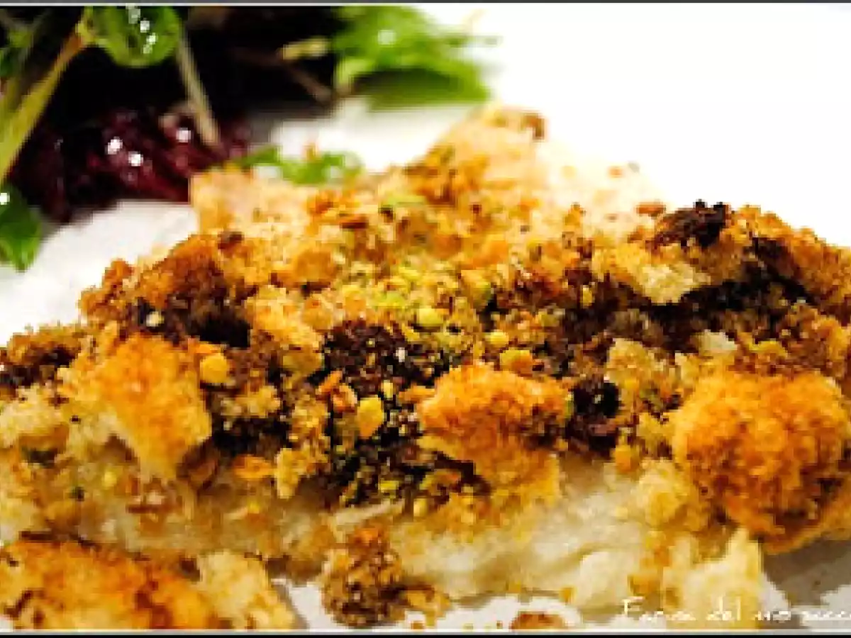 Pesce persico impanato al forno PrecedenteProssimo Portata principalefacile35 min386 Kcal Invia questa ricetta ad un amico Stampa la ricetta Contatta l'autore della Ricetta Pubblica la foto di questa ricetta Ingredienti 2 2 filetti di pesce persico pane raffermo aglio tritato aceto balsamico origano pistacchi olio evo sale e pepe Costo stimato: 2.55Euros€ (1.27€/Porzioni)
