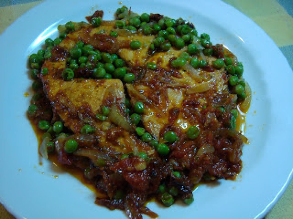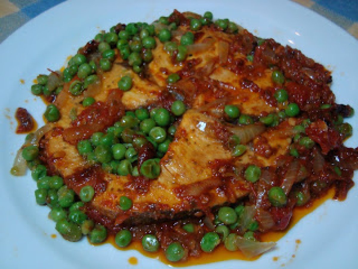 Pesce spada con piselli PrecedenteProssimo Portata principalefacile40 min156 Kcal Invia questa ricetta ad un amico Stampa la ricetta Contatta l'autore della Ricetta Pubblica la foto di questa ricetta Ingredienti 4 tranci di pesce spada piselli salsa di pomodor olio evo cipolla tritata aglio e prezzemolo tritati con poco olio vino bianco