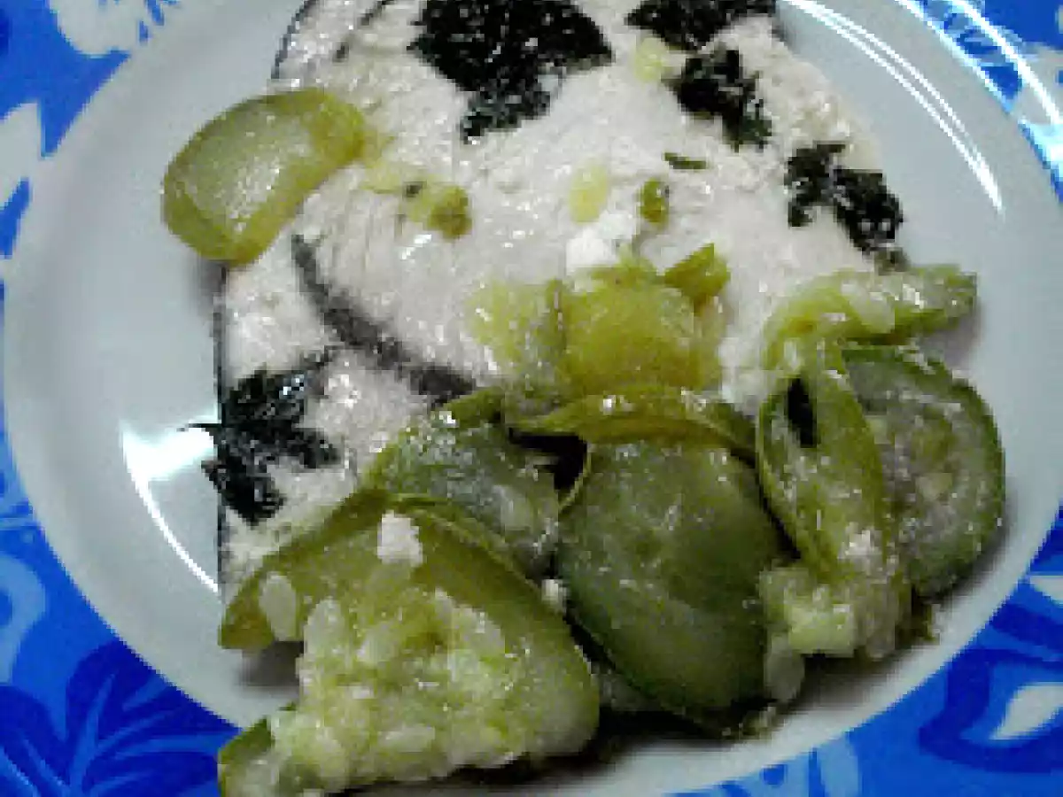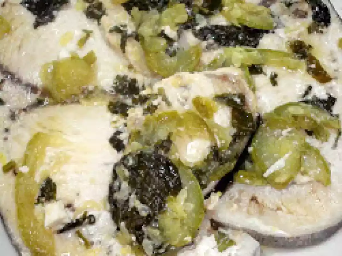 Pesce spada in umido con contorno di zucchine PrecedenteProssimo Portata principalefacile25 min149 Kcal Invia questa ricetta ad un amico Stampa la ricetta Contatta l'autore della Ricetta Pubblica la foto di questa ricetta Ingredienti 4 2 fette di pesce spada surgelate 2 zucchine piccole ½ spicchio di aglio Sale q.b. Pepe nero q.b. 1 peperoncino giallo Olio evo q.b. Basilico tritato fine Prezzemolo tritato fine