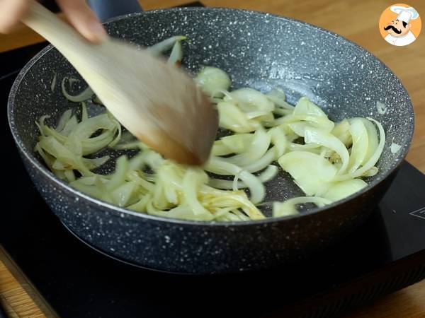 Tagliate la cipolla a fettine e soffriggetela in padella con un filo d'olio. Mettete da parte quando è pronta