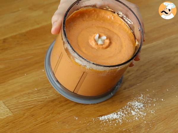 Ora mettete nel frullatore il peperone, la cipolla, la ricotta, il pecorino, il parmigiano, il concentrato di pomodoro, il sale e l'olio d'oliva. Frullate fin quando non otterrete una crema omogenea.