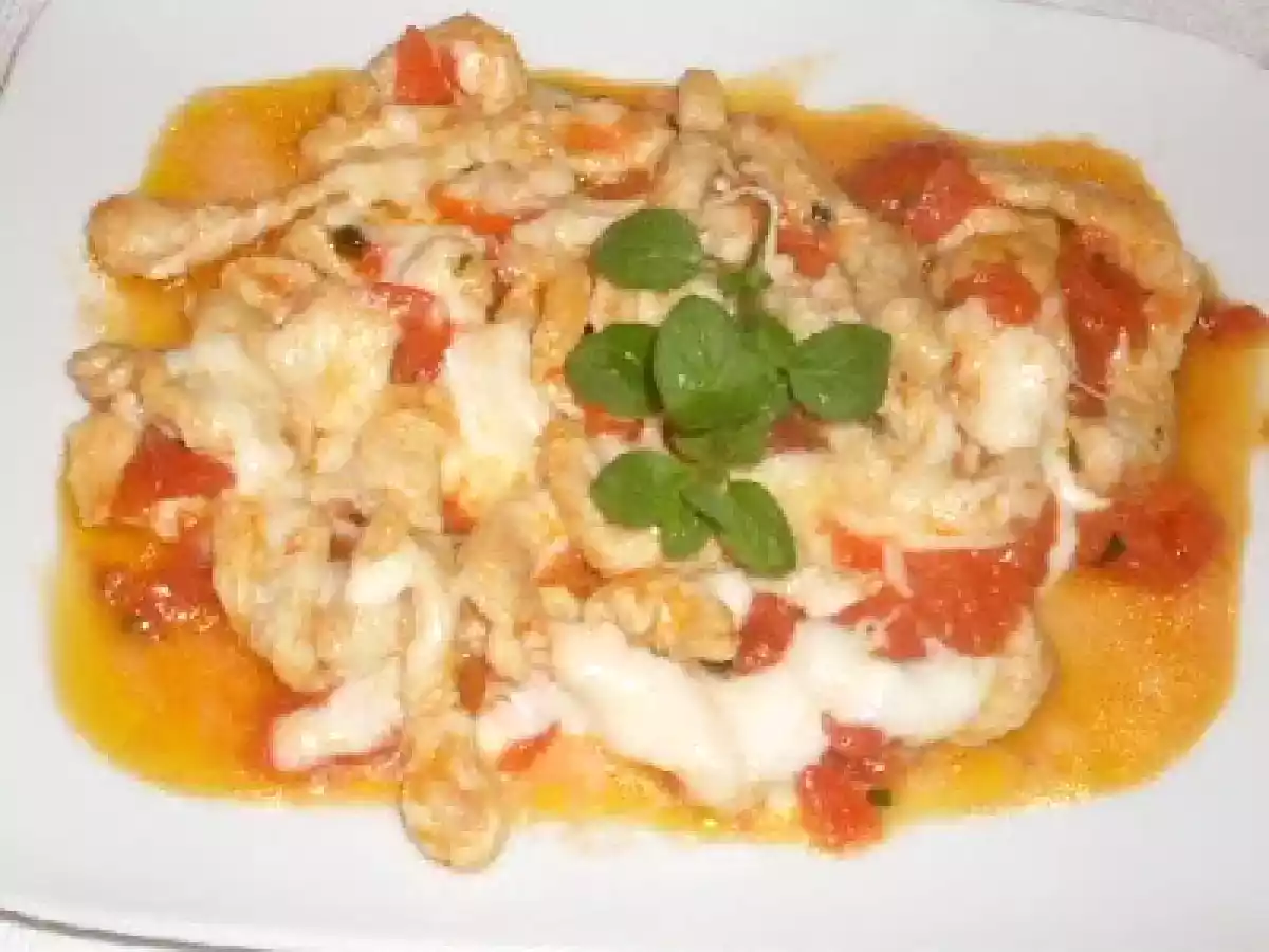 - Tagliare a striscioline le fette di petto di tacchino e infarinarle, tagliare a listarelle anche la mozzarella.