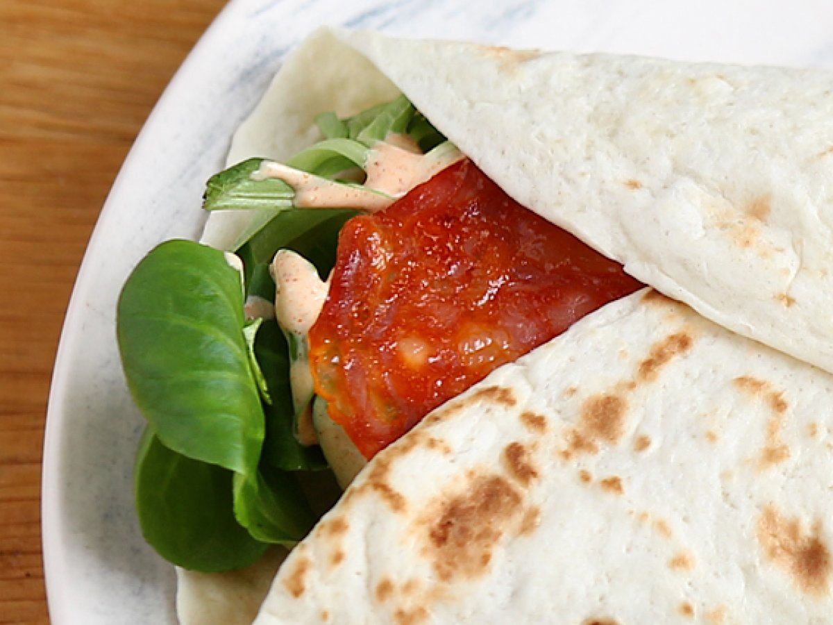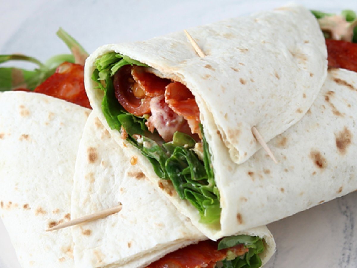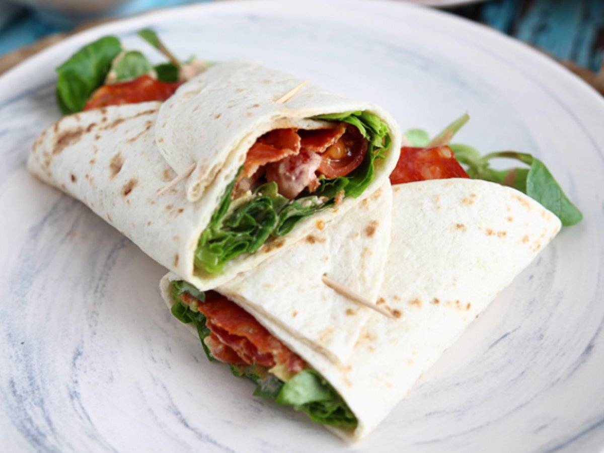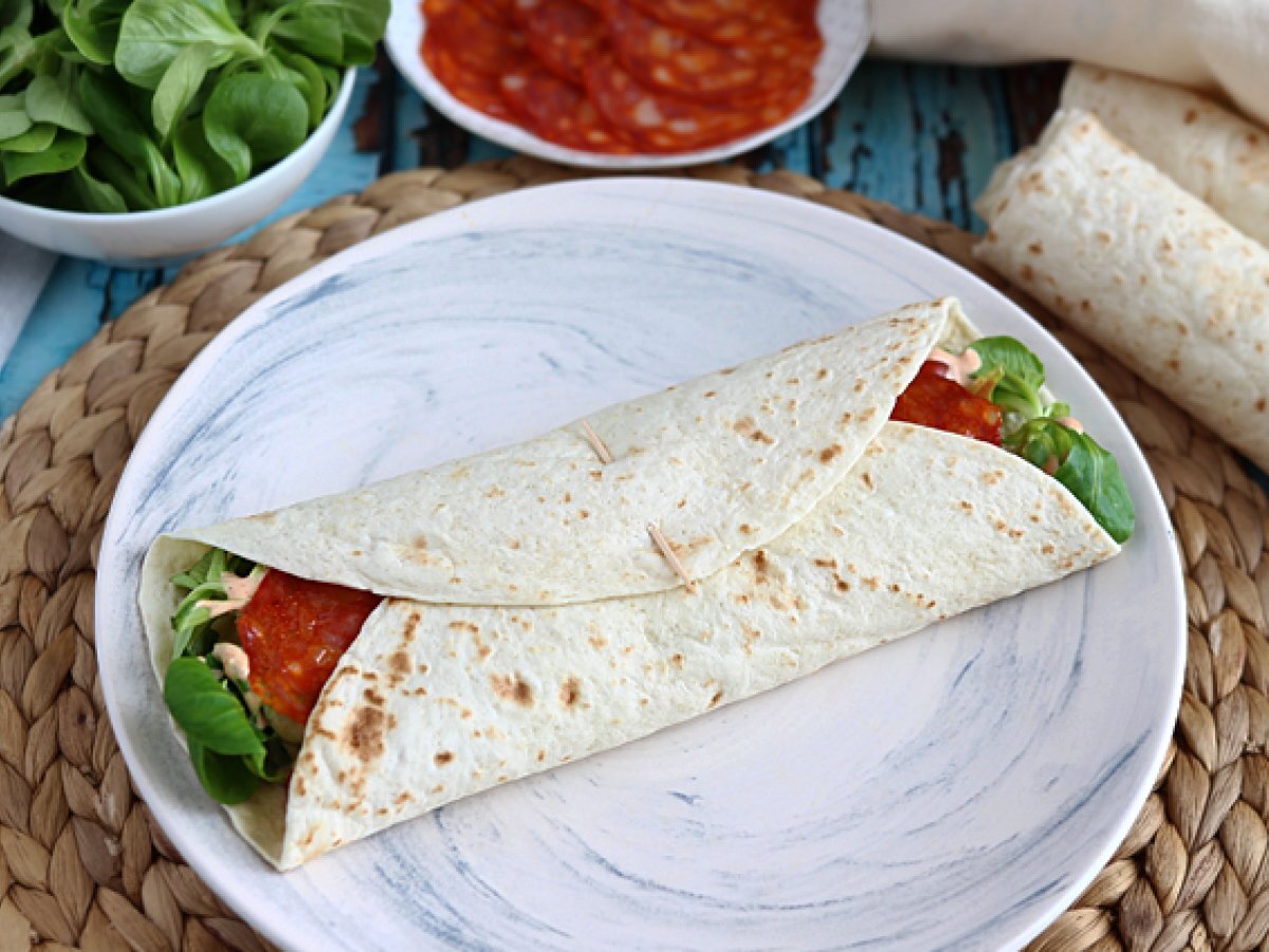 Piadina arrotolata con salame, avocado, valeriana e pomodorini