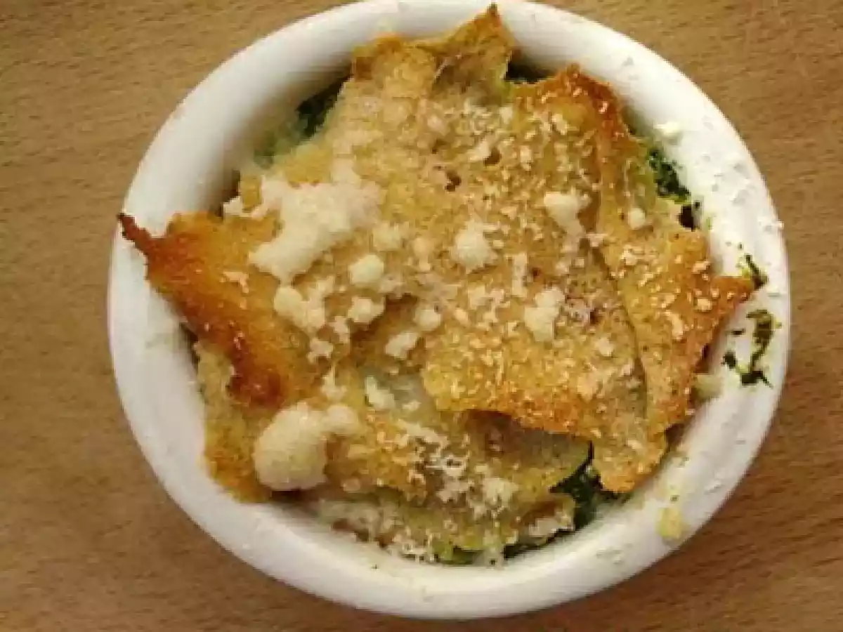 Piatto sfizioso con il pane carasau.. ma integrale! PrecedenteProssimo Portata principalefacile45 min564 Kcal Invia questa ricetta ad un amico Stampa la ricetta Contatta l'autore della Ricetta Pubblica la foto di questa ricetta Ingredienti 4 250 grammi di ricotta vaccina 400 grammi di spinaci 4 fogli di pane carasau integrale 150 grammi di pecorino fresco grattugiato sale e olio qb Costo stimato: 5.35Euros€ (1.34€/Porzioni)