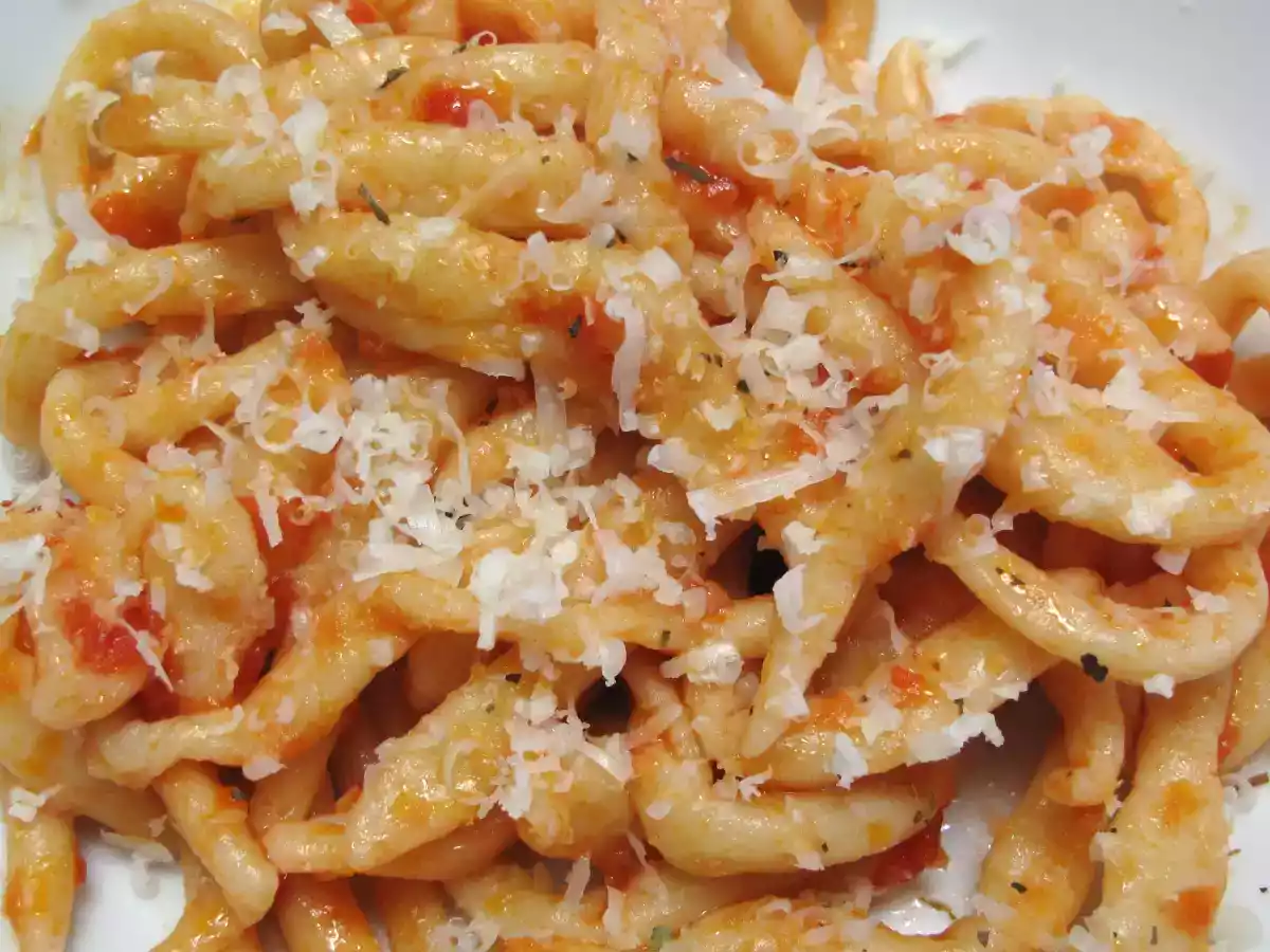 I classici pici senesi fatti in casa e conditi con una salsa di pomodoro, aglio e peperoncino
