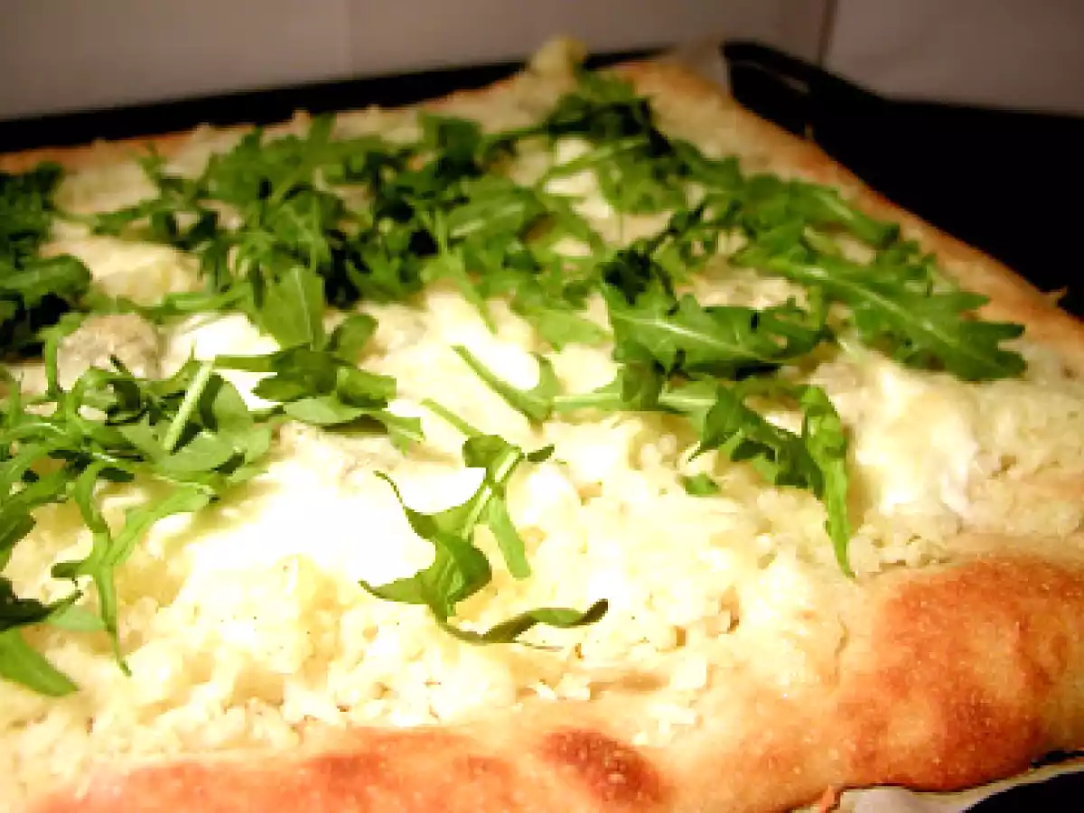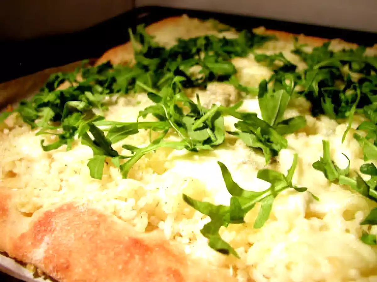 Pizza con le patate, gorgonzola, rucola e olio al rosmarino PrecedenteProssimo Portata principalefacile45 min Invia questa ricetta ad un amico Stampa la ricetta Contatta l'autore della Ricetta Pubblica la foto di questa ricetta Ingredienti 3 per la pasta : 200 g farina manitoba 200 g farina buratto 340 g acqua minerale naturale tiepida 11 g sale 1 cucchiaino zucchero 1 cucchiaio olio extravergine di oliva 2,8 g lievito birra secco Per la farcitura : 150 g Gorgonzola 1 mozzarella di bufala da 250 g 10 g Parmigiano reggiano grattugiato 40 g circa di rucola 500 g patate sale pepe noce moscata 4 grosse foglie di basilico Per li olio aromatico : olio extravergine di oliva 1 spicchio di aglio qlc. ciuffo di rosmarino