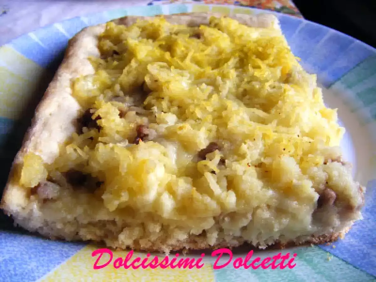 Pizza patate e salsiccia PrecedenteProssimo Portata principalefacile55 min Invia questa ricetta ad un amico Stampa la ricetta Contatta l'autore della Ricetta Pubblica la foto di questa ricetta Ingredienti 5 per una teglia: 500 gr di farina 00 300 ml di acqua 2 cucchiai di olio extravergine d'oliva sale q.b. mezzo cubetto di lievito di birra oppure 1 bustina di lievito in polvere 2 mozzarelle 3 salsicce da circa 100 gr 4 patate medie lesse sale peperoncino olio d'oliva