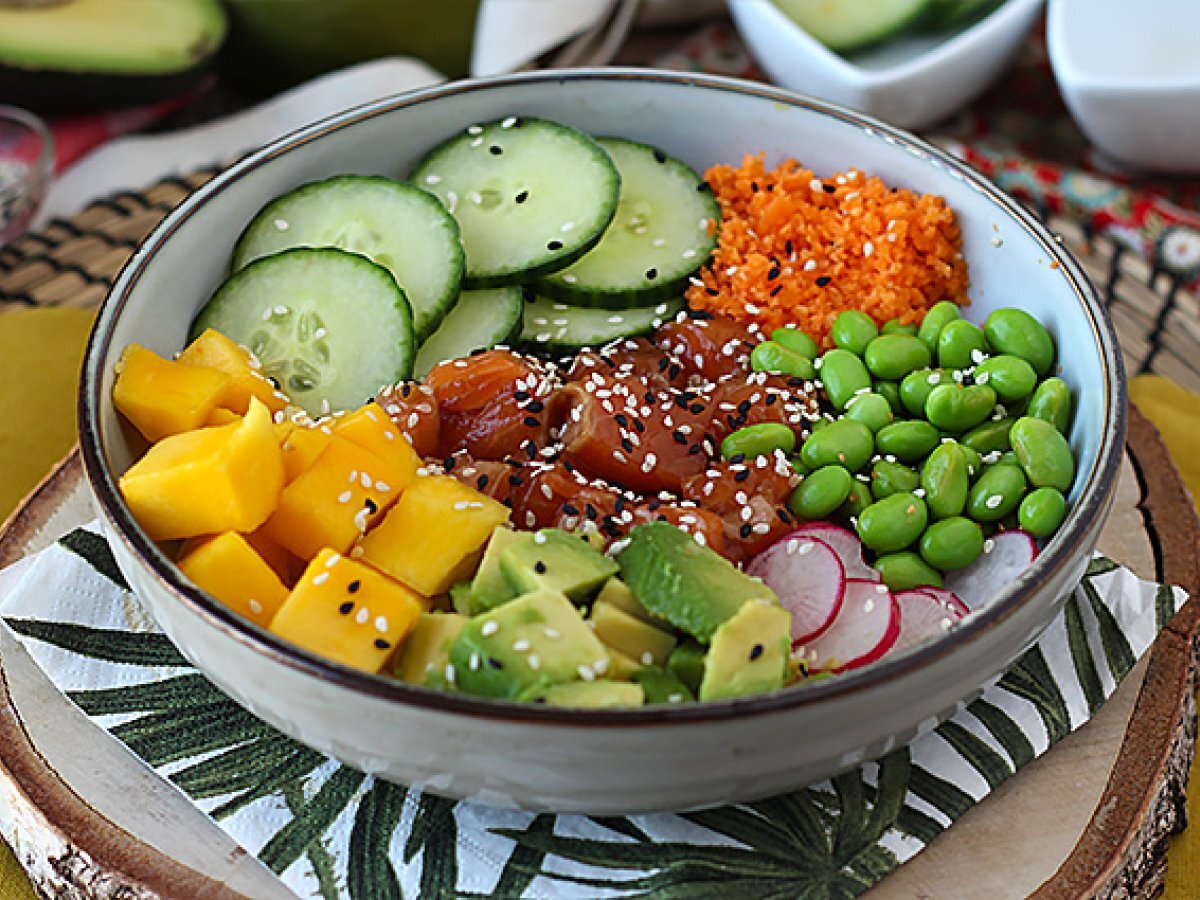 Un piatto Hawaiano di grande tendenza. Una ricetta fresca, colorata e nutriente che fa un po' pensare ad un sushi scomposto: parliamo chiaramente de poke bowl al salmone . Abbiamo deciso di proporvi una versione molto esotica ma potete scegliere voi la frutta e la verdura che preferite per creare l'abbinamento che più si addice ai vostri gusti. Seguite il procedimento dettagliato, provate anche voi a preparare a casa il poke bowl!.