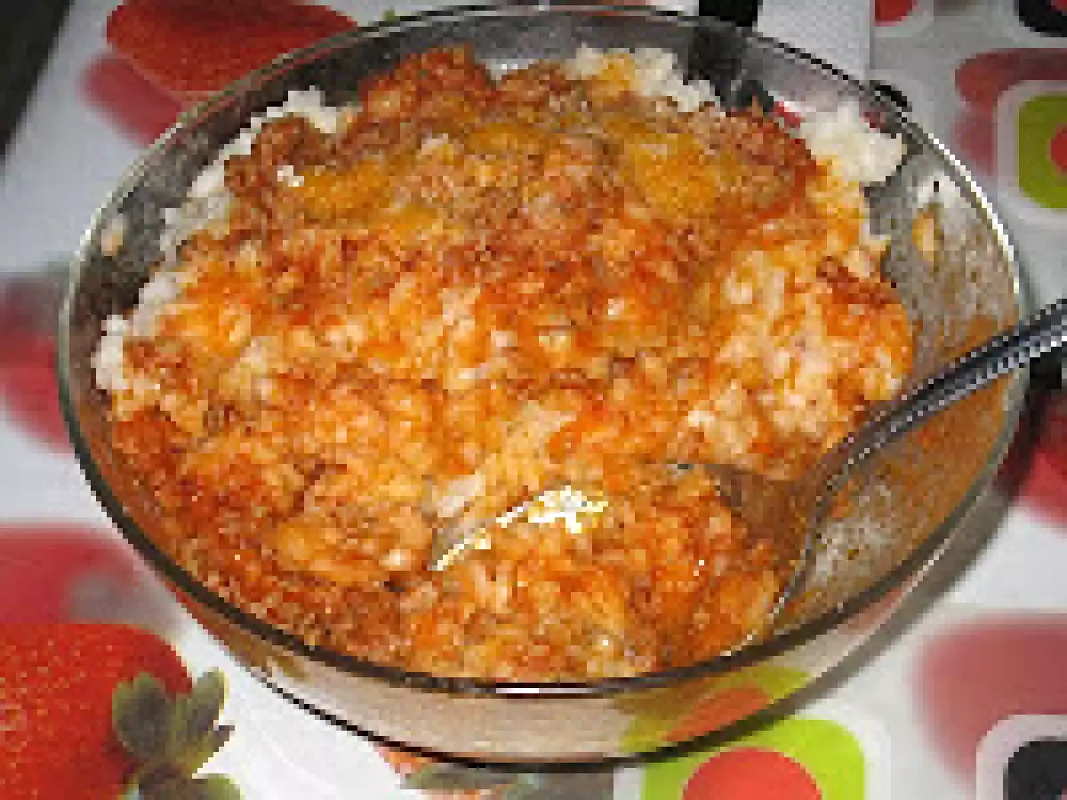 - In una pirofila a questo punto disporre uno strato di formaggio, uno di riso e uno di carne.