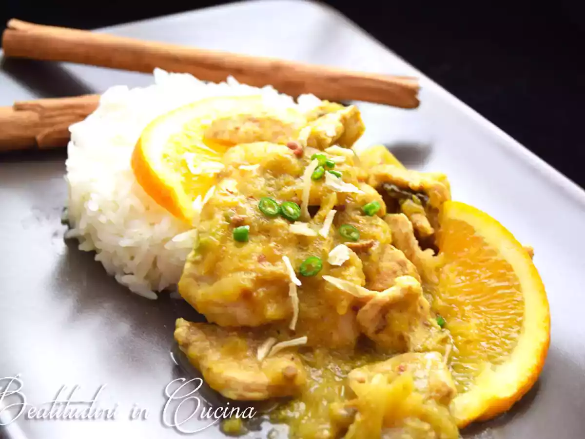 Il pollo al curry e arancia si serve con riso basmati o jasmin, ottimo accompagnamento per il sughetto che si crea durante la cottura, ottenendo così un ottimo piatto unico.