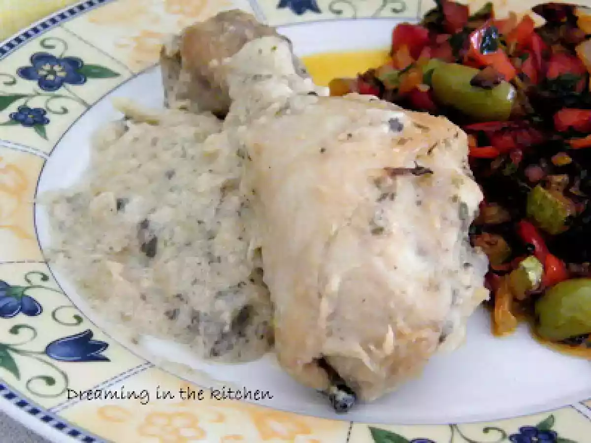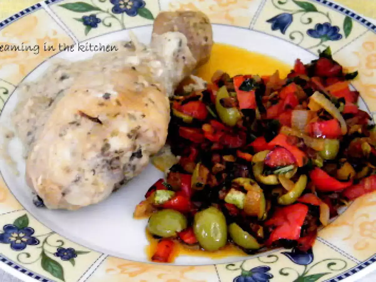 Pollo al tahini e verdure PrecedenteProssimo Portata principalefacile1 h 40 m Invia questa ricetta ad un amico Stampa la ricetta Contatta l'autore della Ricetta Pubblica la foto di questa ricetta Ingredienti 4 4 cosce di pollo 50 ml tahini chiaro il succo di un limone 2 spicchi d'aglio sale 1/4 cucchiaino pepe nero in polvere 2 fogli freschi di alloro 4 fogli di basilico fresco 2 cucchiai olio leggero di mais (evo) 1/3 tazza d'acqua per le verdure: 1 peperone rosso 100 g zucca fresca 1 cipolla rossa una manciata di olive verdi denociolate 2 pomodori freschi 2 fogli freschi di basilico sale 1/3 cucchiaino alloro in polvere 1/4 tazza d'acqua