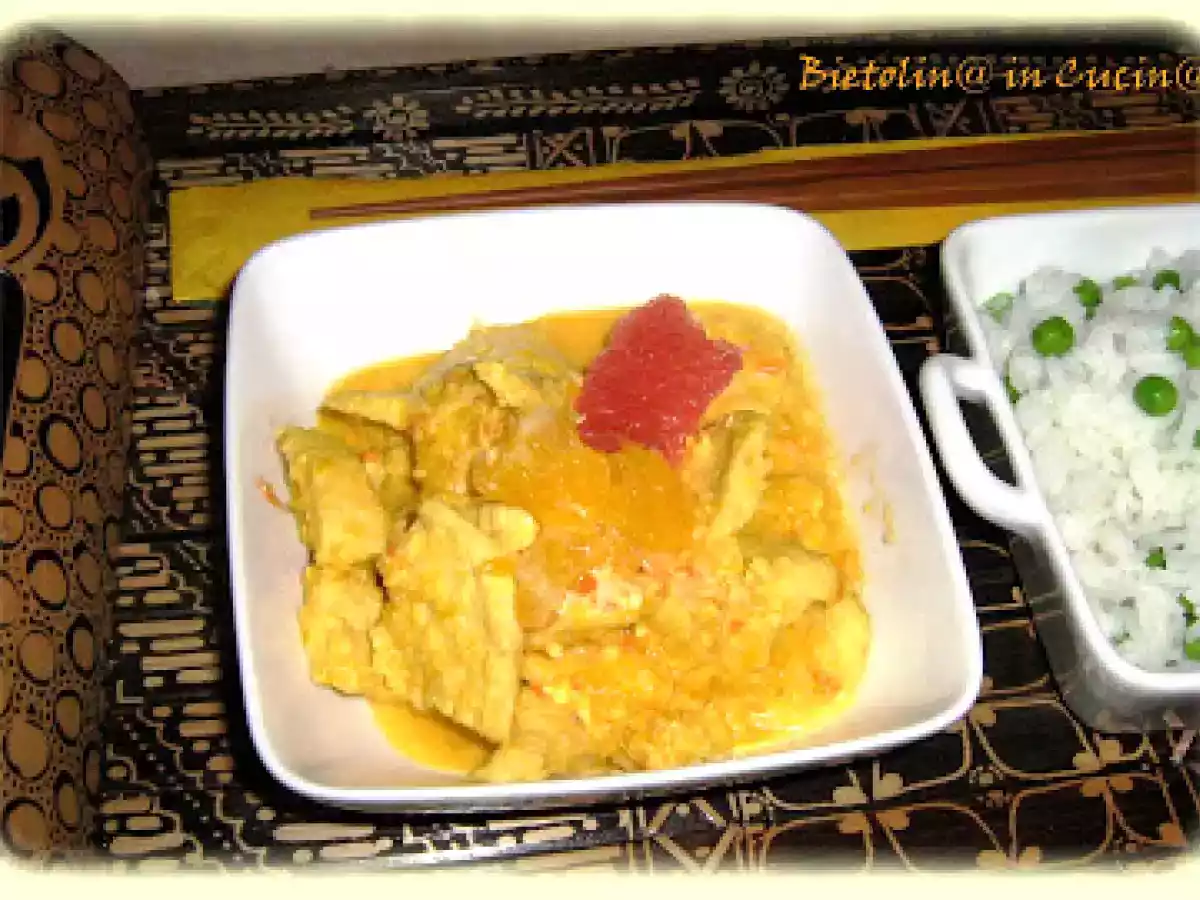 Pollo con agrumi e zafferano e riso thai profumato PrecedenteProssimo Portata principalefacile50 min Invia questa ricetta ad un amico Stampa la ricetta Contatta l'autore della Ricetta Pubblica la foto di questa ricetta Ingredienti 4 500 g di petto di pollo a stracetti 50 g di mandorle in polvere 50 g di parmigiano reggiano grattugiato ½ scalogno 4-5 foglie di salvia succo di ½ pompelmo rosa succo di ½ limone succo di 1 arancia spicchi al vivo di 1 arancia spicchi al vivo di ½ pompelmo rosa 200 ml di latte 30 g di burro sale 1 bustina di zafferano 150 g di riso thai profumato una manciata di piselli surgelat