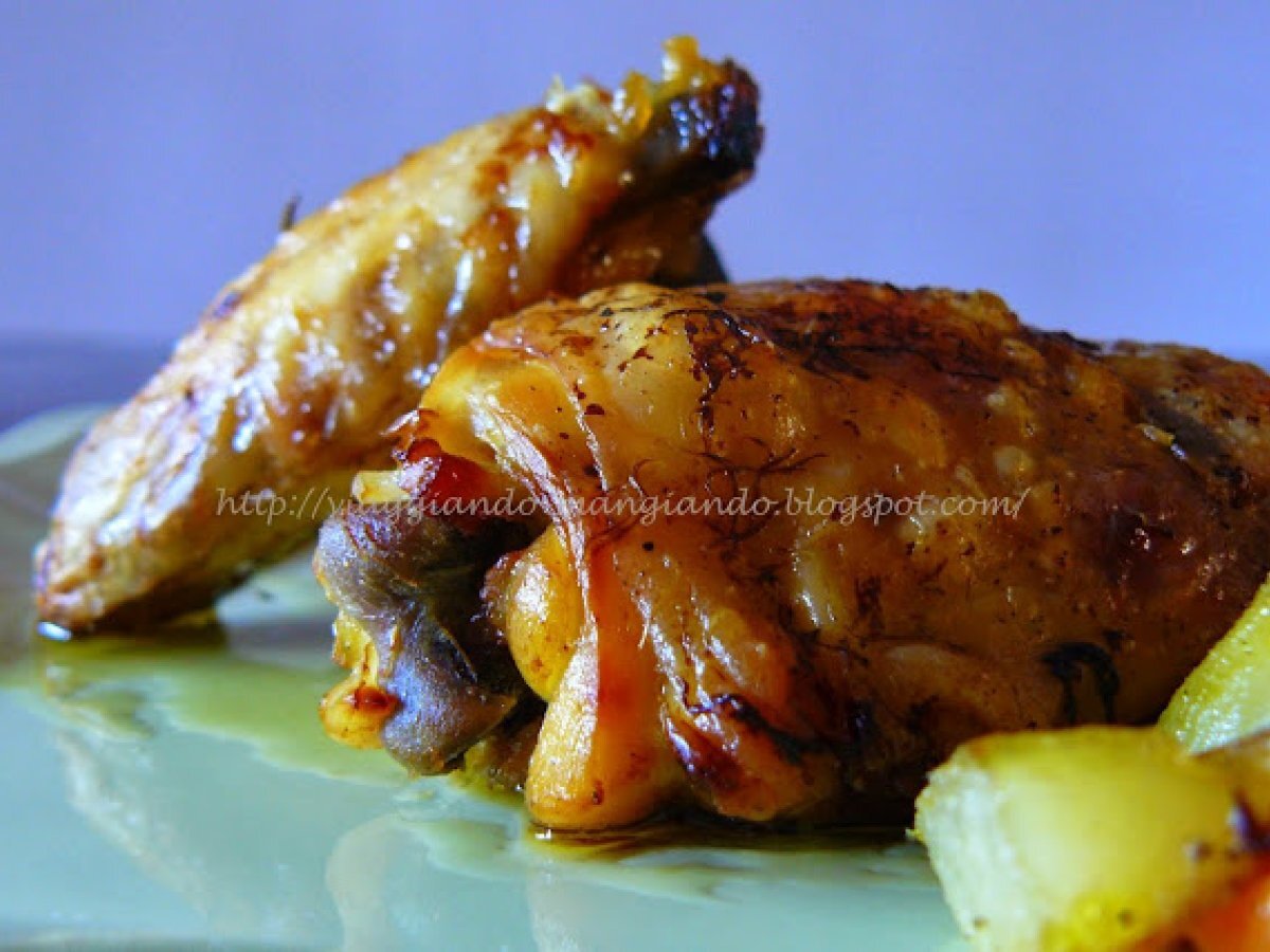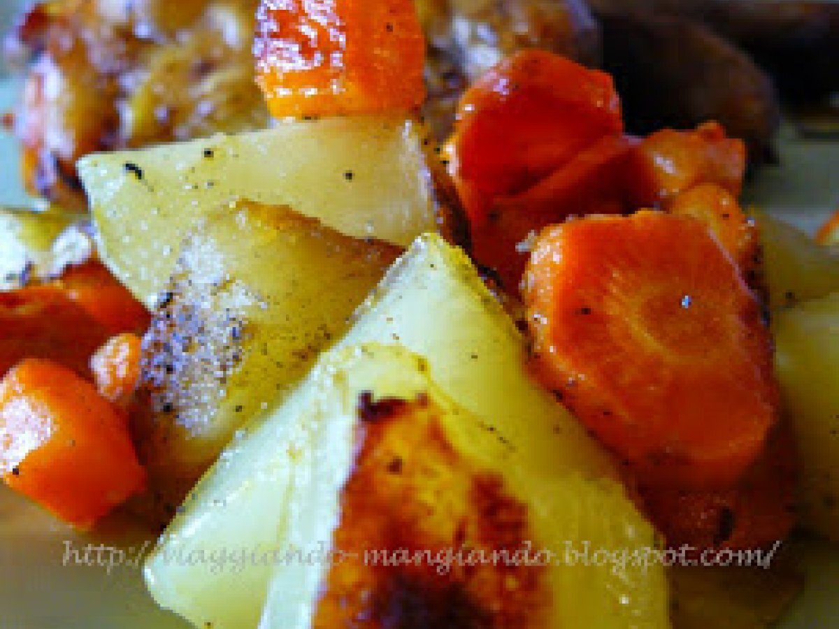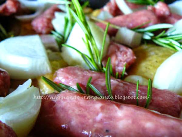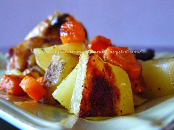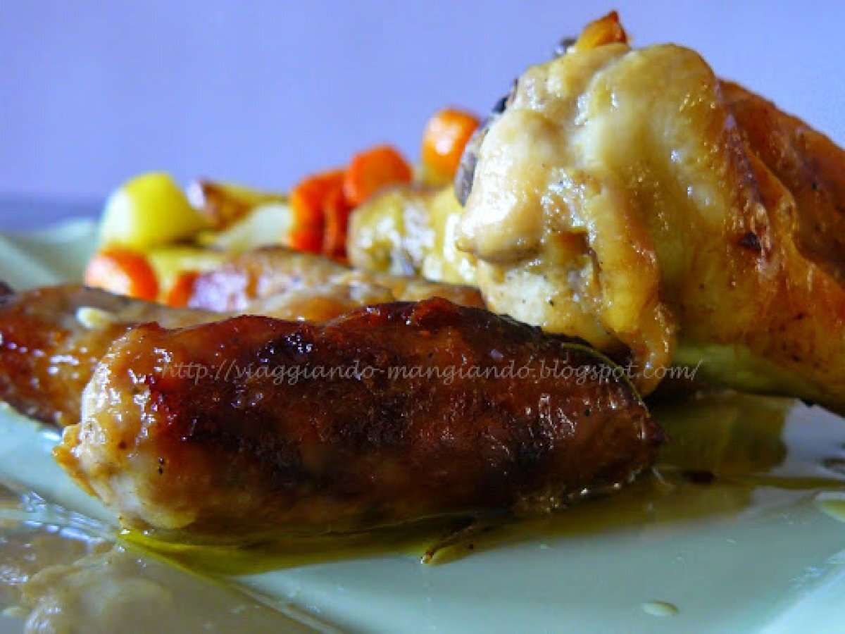 Pollo e salsicce con nigella vota adesso PrecedenteProssimo Portata principalefacile3 h 30 m Invia questa ricetta ad un amico Stampa la ricetta Contatta l'autore della Ricetta Pubblica la foto di questa ricetta Ingredienti 4 6 sovracosce di pollo con la pelle 6 alette di pollo con la pelle 5/6 salsiccette di pollo e tacchino 3 spicchi d'aglio 2 cipolle dorate 4 rametti di rosmarino 5/6 patate 6/7 carote olio evo, sale, pepe
