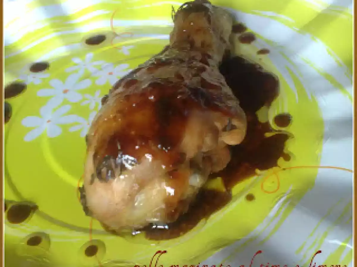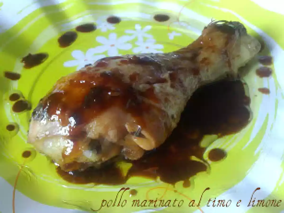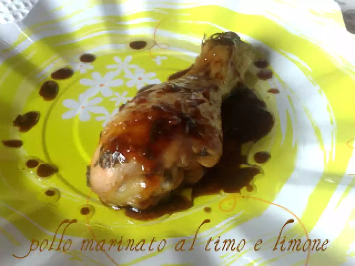 Pollo marinato al timo e limone vota adesso PrecedenteProssimo Portata principalefacile5 h 30 m Invia questa ricetta ad un amico Stampa la ricetta Contatta l'autore della Ricetta Pubblica la foto di questa ricetta Ingredienti 4 4 cosciotti di pollo 2 limoni 2 cucchiai di miele di acacia 3 cucchiai di salsa di soia olio evo molto timo fresco a foglioline 2 spicchi di agli tritati sottilmente della paprica in polvere sale pepe fresco di mulinello