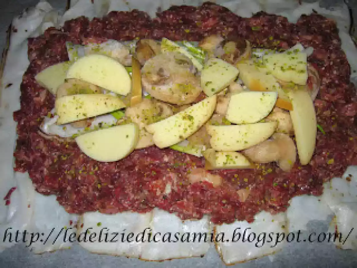 - Impastate bene la carne trita di cavallo,prendete un foglio di carta forno,disponete uno accanto all'altra le fette di lardo,al centro formate un rettangolo con la carne e farcite.