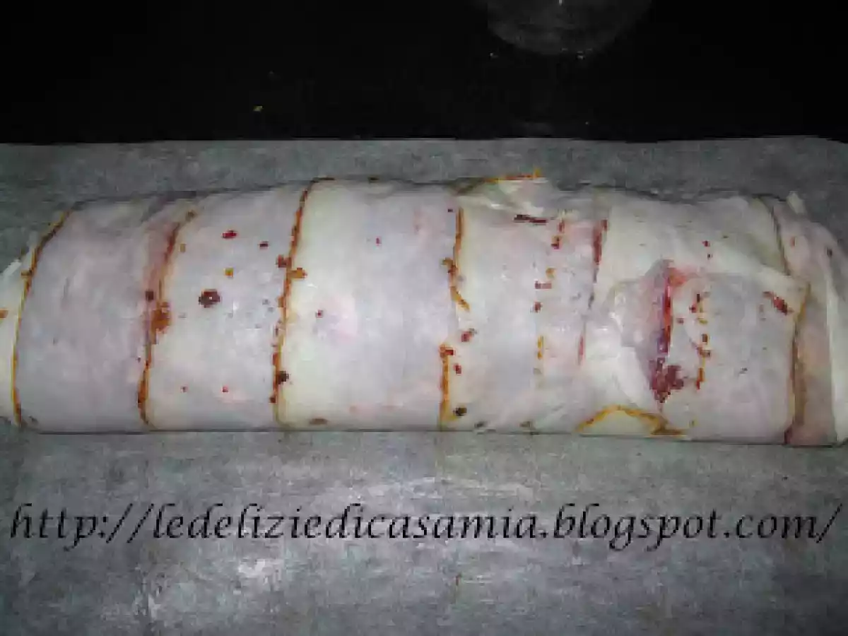 - Con l'aiuto della carta iniziate ad avvolgere bene stretto e con tutta la carta ,mettete dentro una teglia e cuocete in forno.Circa un oretta a fuoco medio.La carta andra' tolta solo quando la carne sara' bene dorata.Affettatelo tiepido.Non aggiungete altri grassi non occorre.