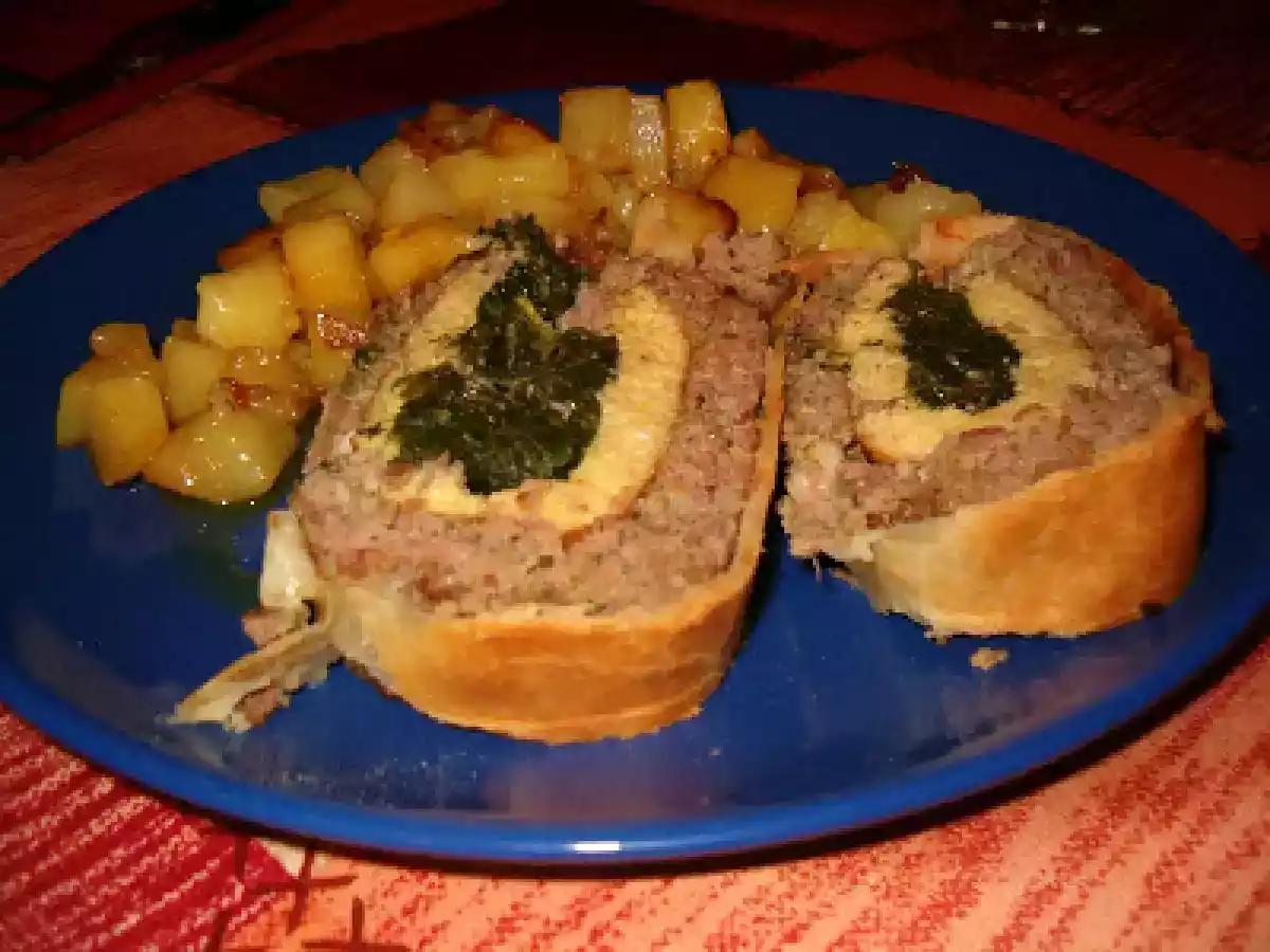 Polpettone ripieno di carne in crosta di pasta brise' e patate arrosto